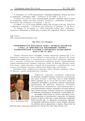Статья содержит анализ биографии, истоков творческой деятельности и особенностей музыкального стиля китайского композитора Ду Минсиня. На основе историко-биографического и музыковедческого анализа были определены структурные и стилевые особенности современной китайской музыки. Охарактеризовав героико-патриотическую эстетику вокальной сюиты Ду Минсиня «Великая китайская стена», автор приходит к выводу об актуальности и необходимости углубленного исследования стилевых особенностей творчества композитора.