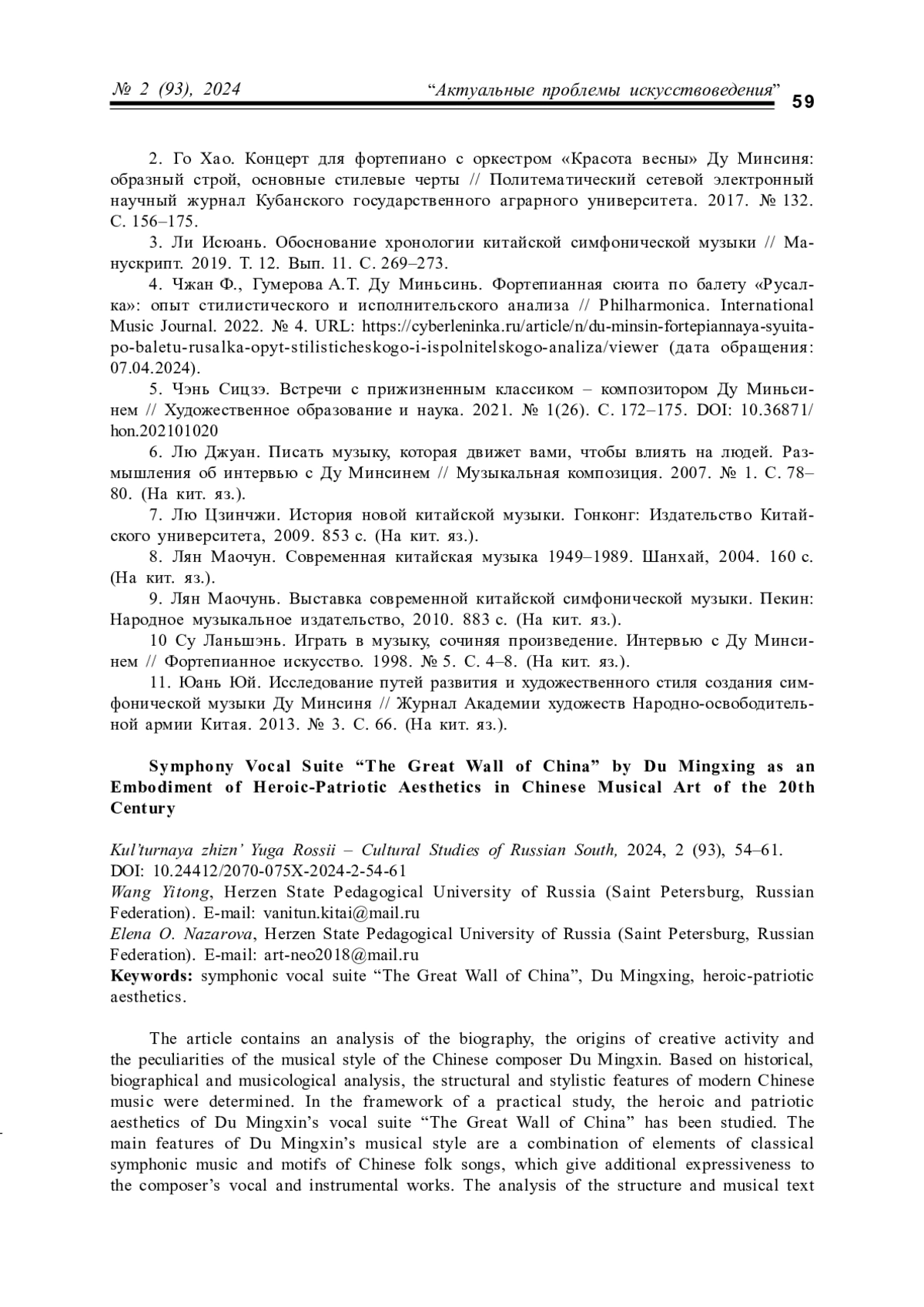 11. Юань Юй. Исследование путей развития и художественного стиля создания симфонической музыки Ду Минсиня // Журнал Академии художеств Народно-освободительной армии Китая. 2013. № 3. С. 66. (На кит. яз.).