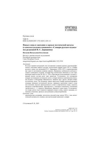 В статье отражен начальный этап составления словника проекта лексикографического описания корпуса русских неологизмов первой трети ХХ в. Словарь русского языка под редакцией Н. С. Державина (1929–1937) охарактеризован как один из источников словника проекта. Выявлены особенности контекстуального компонента издания, который был значительно обновлен за счет привлечения новой поэзии 20–30-х гг. ХХ в. Произведен качественный и количественный анализ состава цитат двух выпусков. Установлено, что основными новыми источниками поэтических цитат словаря являются произведения Демьяна Бедного и Владимира Маяковского; выявлен круг других авторов новых поэтических цитат. На материале девяти выпусков словаря проанализированы основные функции поэтической цитаты: оправдать включение нового слова или значения, показать принадлежность слова к современному языку, отразить авторское новообразование, фиксируемое с помощью компонента толкования «встретилось у…», отразить обновление образного строя языка. Установлено, что новая цитата часто является маркером нового слова, нового значения, изменения семантики, процесса актуализации словоупотребления.