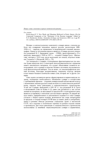 Интерес к контекстуальному компоненту словаря связан с началом ра-боты над словарным описанием корпуса русских неологизмов 1900– 1930-х гг. – периода, не отраженного в академической толковой лексико-графии. Одним из источников проекта является «Словарь русского языка» под редакцией Н. С. Державина (далее – СРЯД), представленный в 23-х выпусках, вышедших с 1929 по 1937 г., – издание Словаря Грота – Шахматова, «которое с 1932 года, после нескольких лет поиска, получило название “седьмого”» [Истратий, 2022, с. 75].