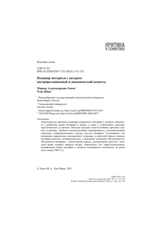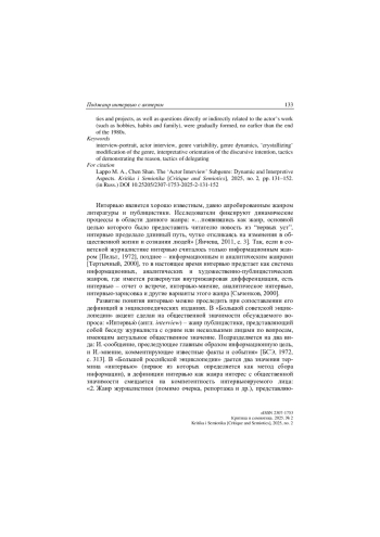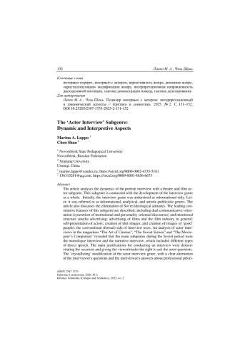 Анализируется динамика поджанра портретного интервью с актером, связанного с развитием жанра интервью в целом, а также с устранением советских идеологических установок. Описаны ведущие конститутивные признаки данного поджанра: двойная коммуникативная направленность, интенциональная структура, конвенциональная сторона текстов интервью. Установлено, что основными вариантами описываемого поджанра в советский период явились интервью-монолог, интервью-рассказ, а ведущими тактиками обоснования необходимости интервью ‒ демонстрация повода, делегирование зрителю / читателю права задавать вопросы актеру. Определено, что «кристаллизующая» модификация жанра интервью с актером складывается постепенно, не ранее чем к концу 1980-х гг.