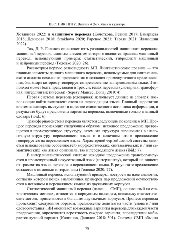 3. Головко Д. Р. Особенности и виды машинного перевода // Вестник Московского информационно-технологического университета - Московского архитектурно-строительного института. 2020. № 4. С. 24-30. EDN: GVOHNH