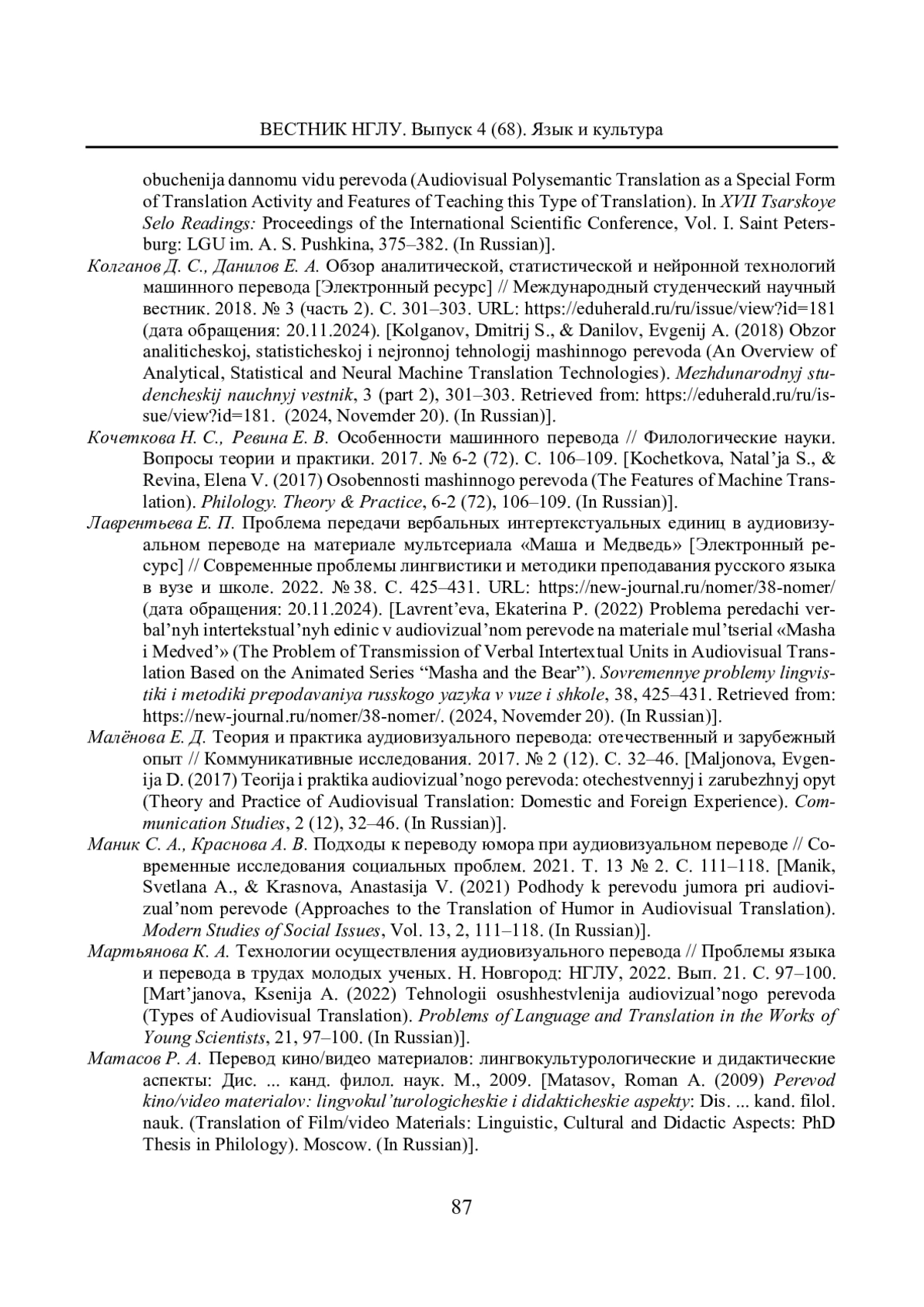 15. Мартьянова К. А. Технологии осуществления аудиовизуального перевода // Проблемы языка и перевода в трудах молодых ученых. Н. Новгород: НГЛУ, 2022. Вып. 21. С. 97-100.