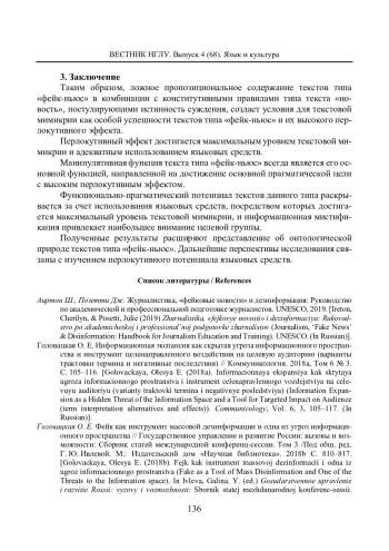 3. Головацкая О. Е. Фейк как инструмент массовой дезинформации и одна из угроз информационного пространства // Государственное управление и развитие России: вызовы и возможности: Сборник статей международной конференц-сессии. Том 3 /Под общ. ред. Г. Ю. Ивлевой. М.: Издательский дом “Научная библиотека”. 2018b C. 810-817.