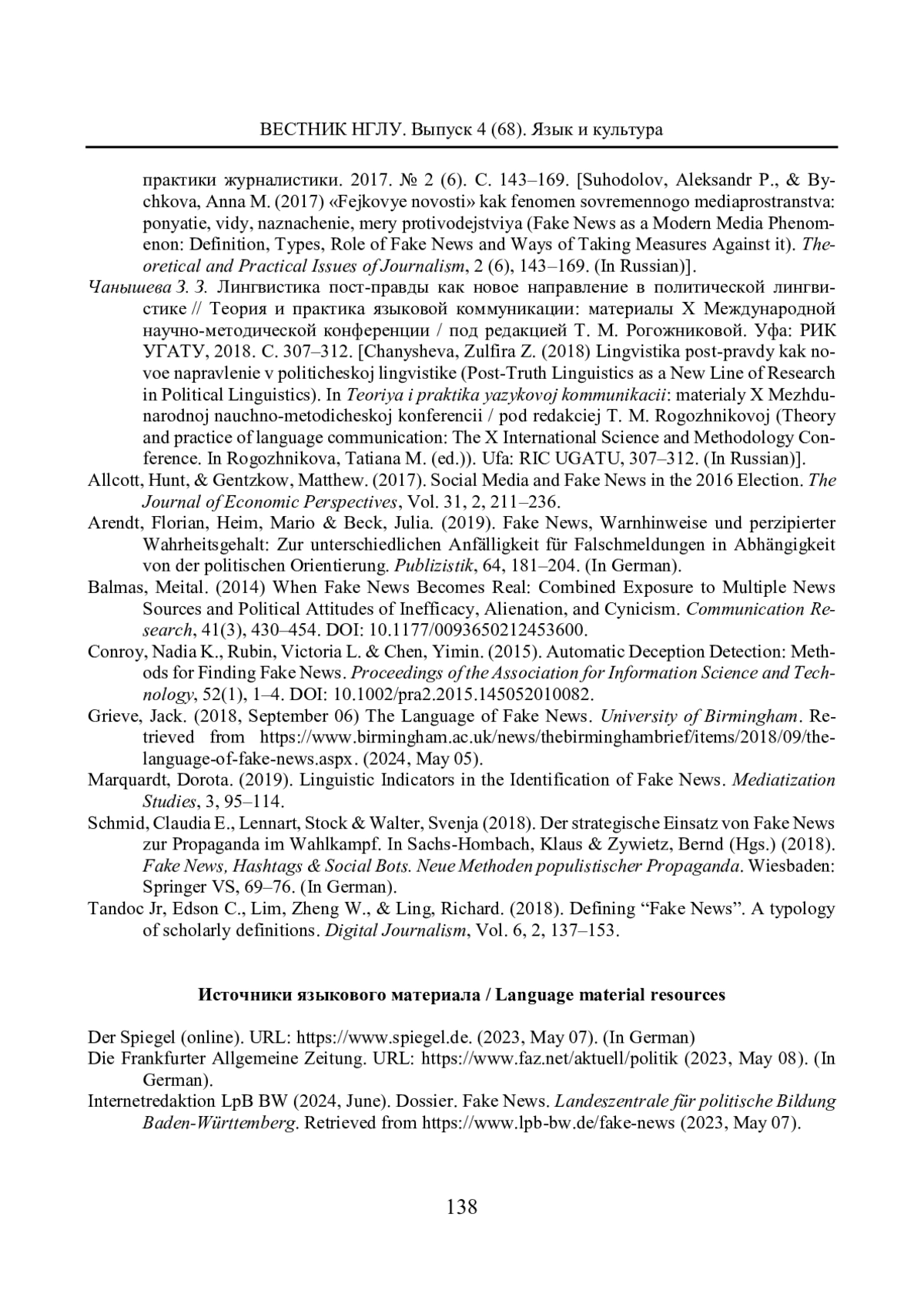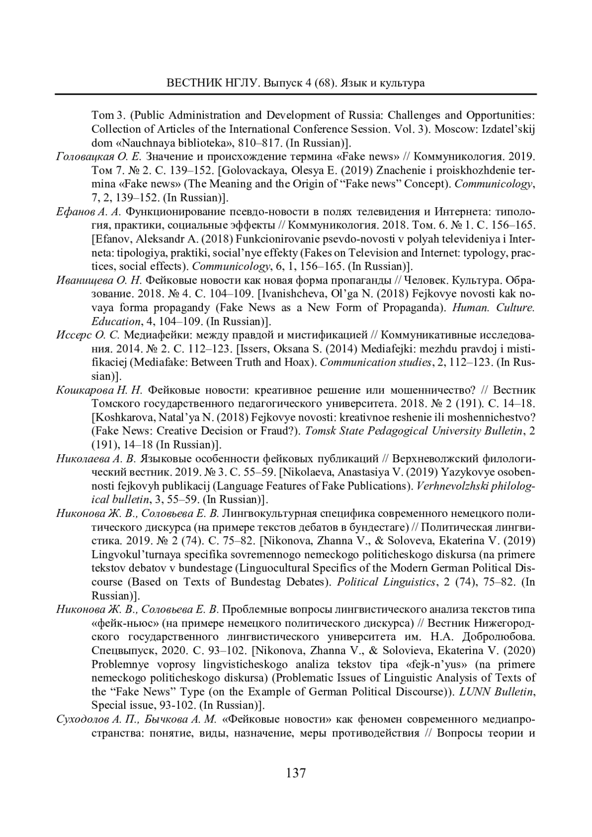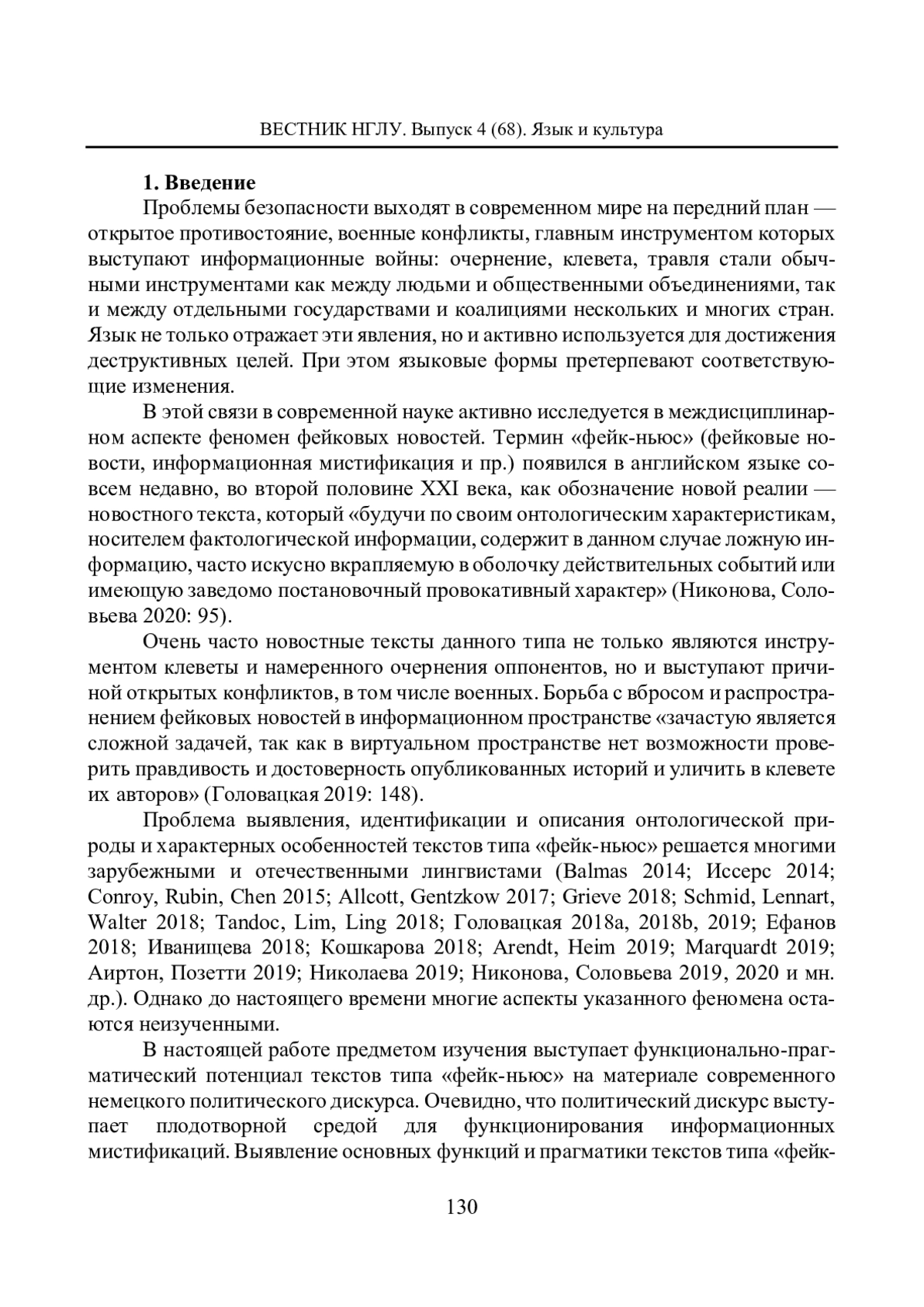11. Никонова Ж. В., Соловьева Е. В. Проблемные вопросы лингвистического анализа текстов типа “фейк-ньюс” (на примере немецкого политического дискурса) // Вестник Нижегородского государственного лингвистического университета им. Н.А. Добролюбова. Спецвыпуск, 2020. С. 93-102.