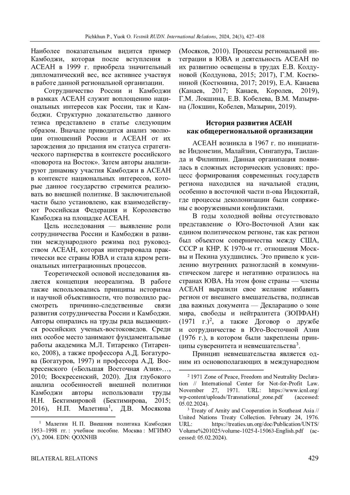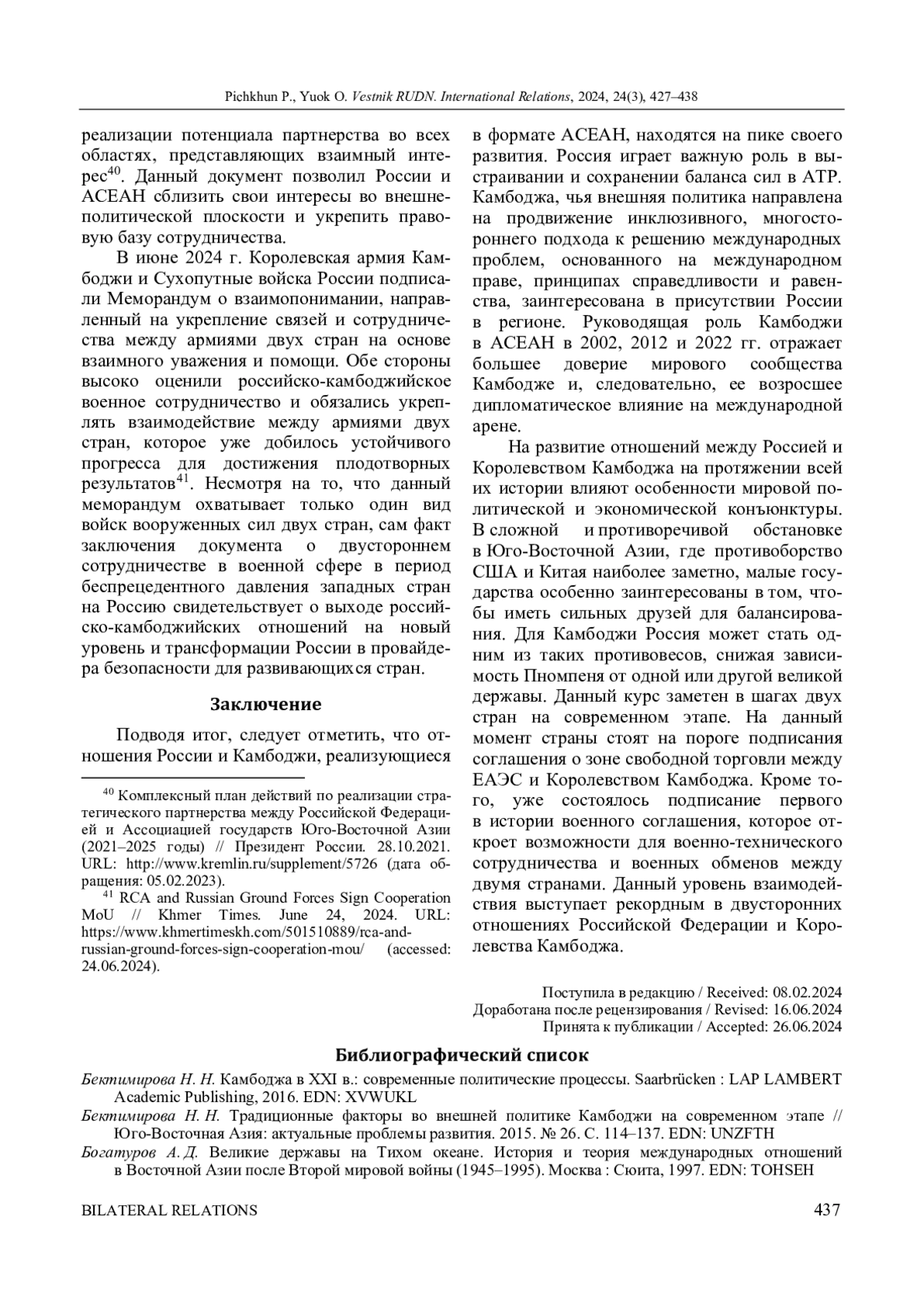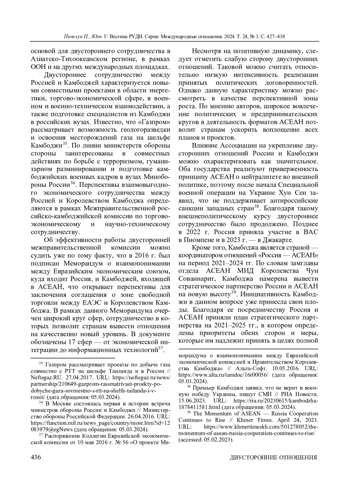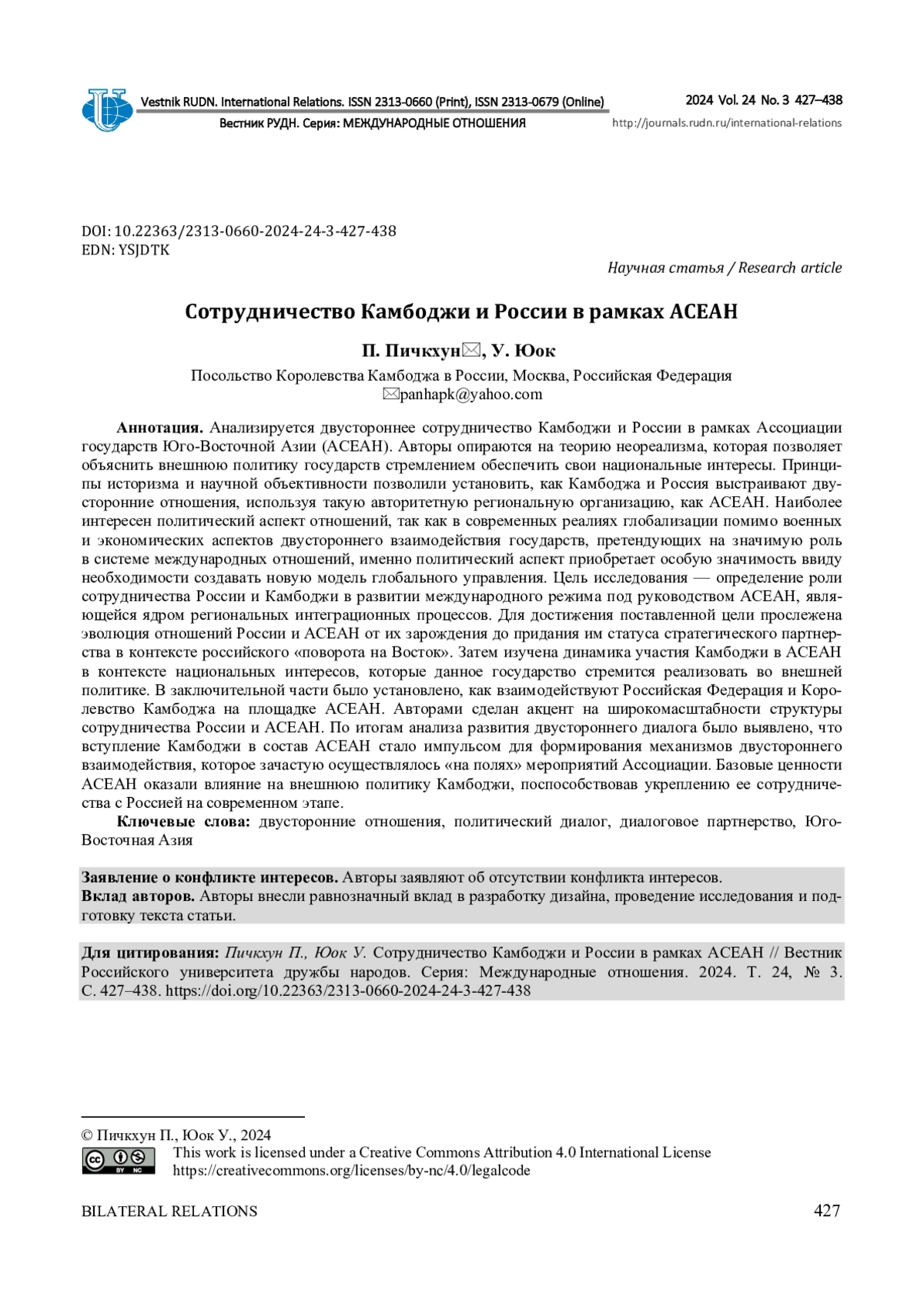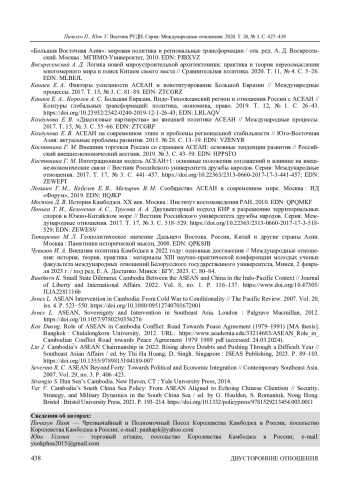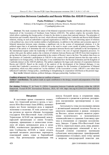 ПИЧКХУН П., ЮОК У. СОТРУДНИЧЕСТВО КАМБОДЖИ И РОССИИ В РАМКАХ АСЕАН // ВЕСТНИК РОССИЙСКОГО УНИВЕРСИТЕТА ДРУЖБЫ НАРОДОВ. СЕРИЯ: МЕЖДУНАРОДНЫЕ ОТНОШЕНИЯ. 2024. ТОМ 24 № 3