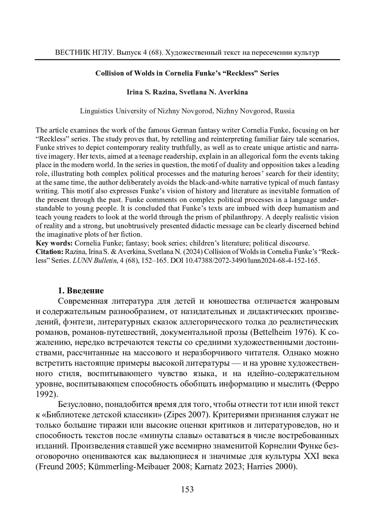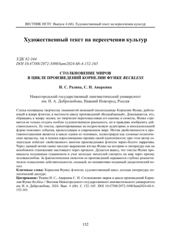 Статья посвящена творчеству знаменитой немецкой писательницы Корнелии Функе, работающей в жанре фэнтези, в частности циклу произведений «Бесшабашный». Доказывается, что, обращаясь к жанру сказки, но творчески переосмысливая его каноны и сюжеты, Функе стремится не только создать особую художественную реальность, но и правдиво изобразить действительность. Ее тексты, ориентированные на подростковую аудиторию, в иносказательной форме поясняют события, происходящие в современном мире. Мотив двойственности и противопоставления является в цикле одним из основных, иллюстрируя как сложные политические процессы, так и поиски взрослеющими героями своей идентичности; при этом автор сознательно избегает свойственного многим произведениям фэнтези черно-белого нарратива. Через данный мотив также находит выражение взгляд Функе на историю и литературу как на неизбежное становление настоящего через прошлое. Делается вывод, что тексты Функе проникнуты подлинным гуманизмом и учат молодых читателей смотреть на мир через призму человеколюбия. За фантастическим сюжетом ее произведений скрывается глубоко реалистическое осмысление действительности, сильный, но ненавязчиво поданный дидактический посыл.