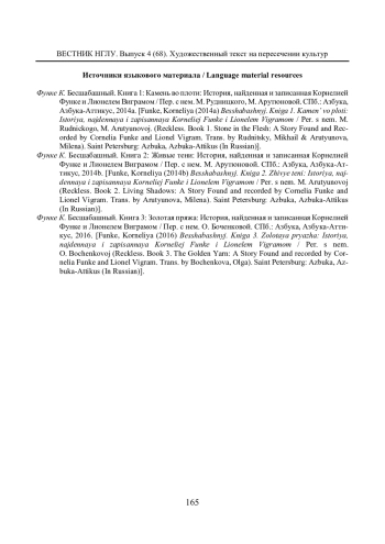 3. Иванова Е. А. Жанровый сдвиг в “Чернильной трилогии” Корнелии Функе // Мировая литература в контексте культуры. Проблематика и поэтика мировой литературы. 2023. № 16 (22). С. 5-10.