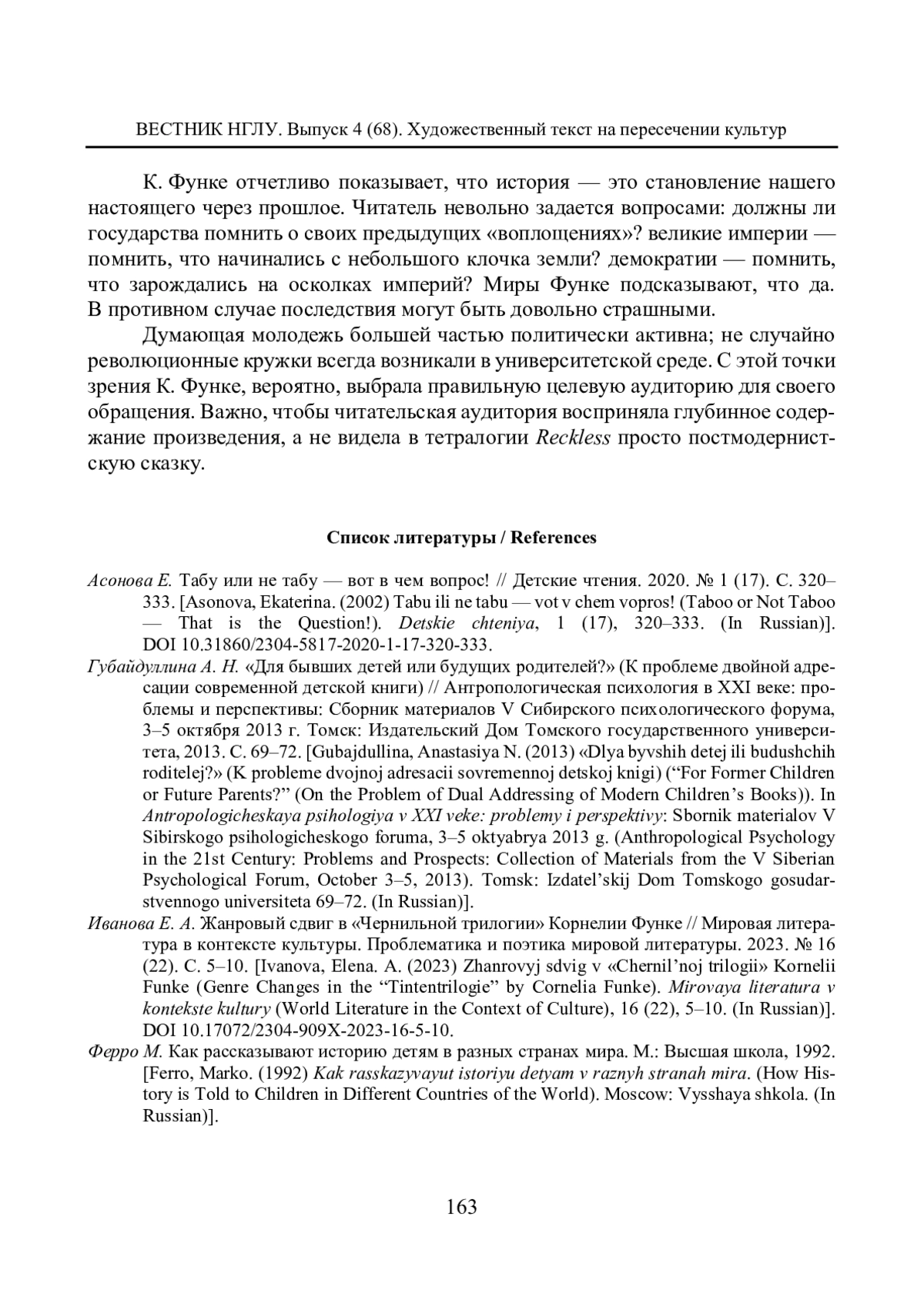 5. Asonova, Ekaterina, & Bukhina, Olga. (2020) Everything is New: The Publishers, the Writers, and Most Importantly, the Readers. Trans. by Leyn, Irina. Bookbird: A Journal of International Children’s Literature, 58 (2), 1-12. EDN: MGPAUW