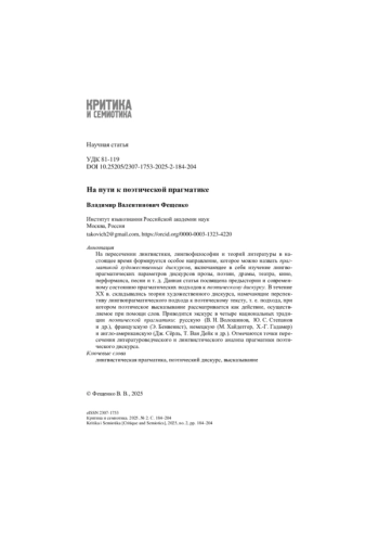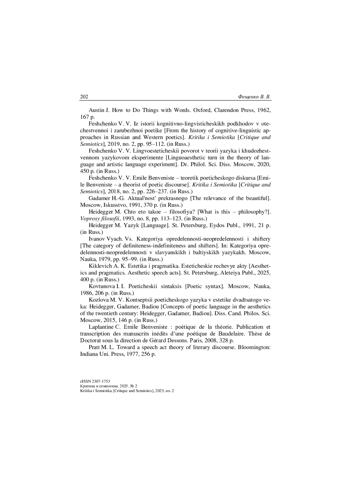 16. Фещенко В. В. Эмиль Бенвенист - теоретик поэтического дискурса // Критика и семиотика. 2018. № 2. C. 226-237.
