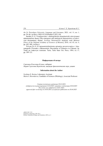 12. Цивьян Ю. Г. К метасемиотическому описанию повествования в кинематографе // Труды по знаковым системам. Тарту: Тартуский гос. ун-т, 1984. Вып. 17. С. 109-121.