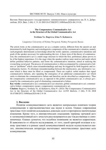 В статье рассматривается коммуникативный акт как нетождественный речевому акту и понимаемый как сложное явление, включающее как лингвистические, так и экстралингвистические составляющие коммуникативной ситуации, такие прагматические детерминанты, как: знания о мире, мнения, установки, цели адресанта, необходимые для понимания текста. Коммуникативный акт, являющийся центральным понятием теории коммуникации, оказывается многоэтапной структурой, где наиболее важным этапом является первый, подготовительный или превербальный этап, когда происходит осознание мотивов, потребностей, определяющих возможные варианты поведения (коммуникативные стратегии и тактики), и формируется коммуникативная интенция, направленная на реализацию глобальной социальной цели. Процесс коммуникации нередко характеризуется возникновением коммуникативных неудач, определяемых как некоторая «проблема» в общении, вызывающая непонимание между коммуникантами, причинами которой служат как лингвистические, так и экстралингвистические факторы. Устранение непонимания требует восполнения информационного вакуума, то есть компенсации. Сигналом о наличии коммуникативной неудачи могут служить эксплицитные вербальные маркеры, которые также сообщают о том, что в структуре основного глобального коммуникативного акта возникает дополнительный коммуникативный акт, направленный на преодоление коммуникативной неудачи, а следовательно, описываемый в терминах компенсаторности. Компенсационный коммуникативный акт, в отличие от глобального коммуникативного акта, всегда управляется коммуникативной целью преодоления коммуникативной неудачи.