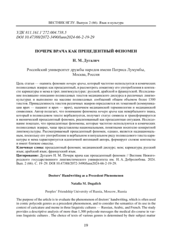 Цель статьи - оценить феномен почерк врача, который частотно используется в комических поликодовых жанрах как прецедентный, и рассмотреть семантику его употребления в контексте карикатуры и мема в трех лингвокультурах: русской, арабской и французской. Исследование посвящено описанию поликодовых текстов медицинского дискурса в различных лингвокультурах и выполнено на массиве поликодовых сообщений общим объемом более 1300 текстов. Принадлежность текстов различных жанров определяется их тематикой (коммуникация врач - пациент и врач - врач), наличием медицинской терминологии и медицинской символики. Автор полагает, что понимание феномена почерк врача как невербального знака, который в поликодовом тексте вербализуется, получает статус символа и трансформируется в иконический прецедентный феномен, реализованный как прецедентная ситуация. Исследование показало, что прецедентные феномены, которые частотно используются в комических поликодовых жанрах, чаще представлены национальными, понятными носителю конкретной лингвокультуры. Рассматриваемый прецедентный феномен, однако, является наднациональным, поскольку его употребление в вербальном и визуальном ряду поликодового текста карикатуры и мема характеризуется идентичной интенцией автора, формирует схожие контексты и имеет близкие смыслы.