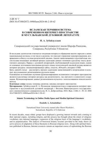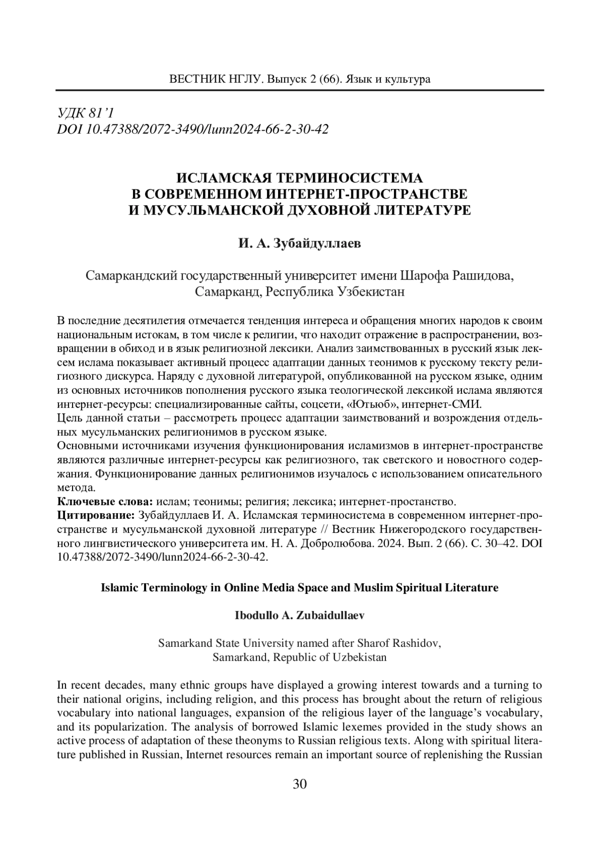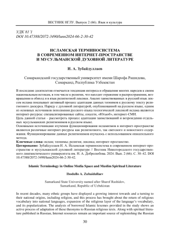 В последние десятилетия отмечается тенденция интереса и обращения многих народов к своим национальным истокам, в том числе к религии, что находит отражение в распространении, возвращении в обиход и в язык религиозной лексики. Анализ заимствованных в русский язык лексем ислама показывает активный процесс адаптации данных теонимов к русскому тексту религиозного дискурса. Наряду с духовной литературой, опубликованной на русском языке, одним из основных источников пополнения русского языка теологической лексикой ислама являются интернет-ресурсы: специализированные сайты, соцсети, «Ютьюб», интернет-СМИ. Цель данной статьи - рассмотреть процесс адаптации заимствований и возрождения отдельных мусульманских религионимов в русском языке. Основными источниками изучения функционирования исламизмов в интернет-пространстве являются различные интернет-ресурсы как религиозного, так светского и новостного содержания. Функционирование данных религионимов изучалось с использованием описательного метода.
