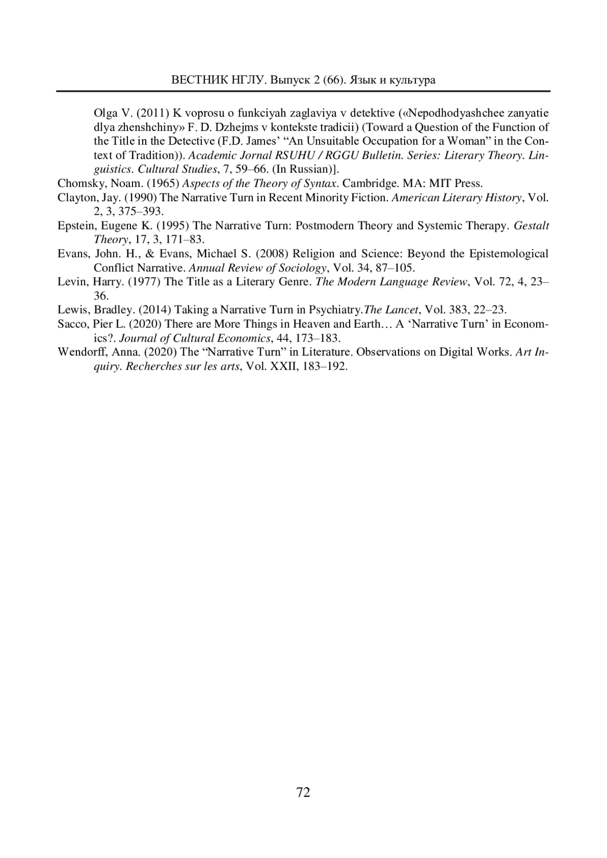 17. Федунина О. В. К вопросу о функциях заглавия в детективе (“Неподходящее занятие для женщины” Ф. Д. Джеймс в контексте традиции) // Вестник РГГУ. Серия: Литературоведение. Языкознание. Культурология. 2011. №. 7 (69). С. 59-66. EDN: NXZBAR