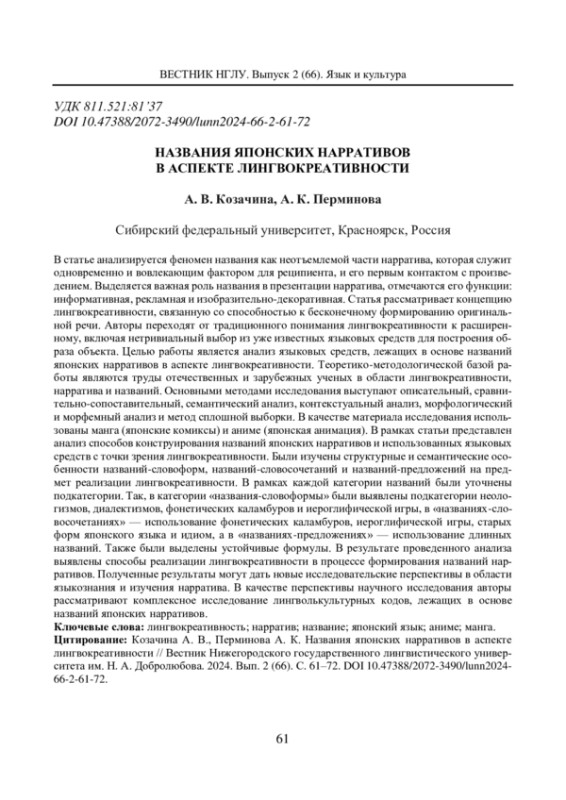 В статье анализируется феномен названия как неотъемлемой части нарратива, которая служит одновременно и вовлекающим фактором для реципиента, и его первым контактом с произведением. Выделяется важная роль названия в презентации нарратива, отмечаются его функции: информативная, рекламная и изобразительно-декоративная. Статья рассматривает концепцию лингвокреативности, связанную со способностью к бесконечному формированию оригинальной речи. Авторы переходят от традиционного понимания лингвокреативности к расширенному, включая нетривиальный выбор из уже известных языковых средств для построения образа объекта. Целью работы является анализ языковых средств, лежащих в основе названий японских нарративов в аспекте лингвокреативности. Теоретико-методологической базой работы являются труды отечественных и зарубежных ученых в области лингвокреативности, нарратива и названий. Основными методами исследования выступают описательный, сравнительно-сопоставительный, семантический анализ, контекстуальный анализ, морфологический и морфемный анализ и метод сплошной выборки. В качестве материала исследования использованы манга (японские комиксы) и аниме (японская анимация). В рамках статьи представлен анализ способов конструирования названий японских нарративов и использованных языковых средств с точки зрения лингвокреативности. Были изучены структурные и семантические особенности названий-словоформ, названий-словосочетаний и названий-предложений на предмет реализации лингвокреативности. В рамках каждой категории названий были уточнены подкатегории. Так, в категории «названия-словоформы» были выявлены подкатегории неологизмов, диалектизмов, фонетических каламбуров и иероглифической игры, в «названиях-словосочетаниях» - использование фонетических каламбуров, иероглифической игры, старых форм японского языка и идиом, а в «названиях-предложениях» - использование длинных названий. Также были выделены устойчивые формулы. В результате проведенного анализа выявлены способы реализации лингвокреативности в процессе формирования названий нарративов. Полученные результаты могут дать новые исследовательские перспективы в области языкознания и изучения нарратива. В качестве перспективы научного исследования авторы рассматривают комплексное исследование лингволькультурных кодов, лежащих в основе названий японских нарративов.