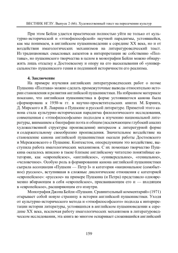 В статье исследуется становление английской пушкинистики в период 10-40-х гг. XX века с акцентом на общей линии осмысления «Полтавы» Пушкина в связи с применением приема сопоставления поэта с Петром I. Доказывается, что этот вопрос не получил должного научного освещения. Делаются промежуточные выводы относительно логики развития английской пушкинистики. Доказывается, что в форме устоявшегося канона она была сформирована к 1950-м гг. в научно-просветительских книгах М. Бэринга, Д. Мирского и Я. Лаврина о Пушкине и русской литературе. Утверждается, что концепция пушкинского творчества повлияла как на книги Лаврина и отчасти Мирского, так и на английскую пушкинистику в целом. Приметой английского пушкиноведческого канона стала культурно-историческая парадигма филологического исследования, совмещенная с этнофилософским подходом к изучению национальной литературы, вниманием к биографии поэта и к общим особенностям художественной формы и содержания произведения. Определено, что на становление канона английской пушкинистики значительное воздействие оказали работы Достоевского и Мережковского о Пушкине. Контекстом, опосредующим это воздействие, выступили имагологические механизмы уподобления и упрощения. С их помощью творчество Пушкина было вписано в такие близкие английскому читателю понятийные категории, как «европейское», «английское», «универсальное», «гениальное», «человечное». Выявлено, что «русское» на примере Пушкина (и Петра) представало одновременно вбирающим в себя «европейское», присваивающим его и - входящим в «европейское», расширяющим его изнутри. Доказано, что монография Джона Бейли «Пушкин. Сравнительный комментарий» (1971) открывает собой новую страницу в истории английской пушкинистики. Уходя от культурно-исторического метода и этнофилософского подхода к литературе, исключая работу имагологических механизмов в литературоведческом исследовании, эта книга предлагает новые ориентиры: сравнительно-историческую парадигму в сочетании с методикой пристального чтения и вниманием к советскому пушкиноведению.