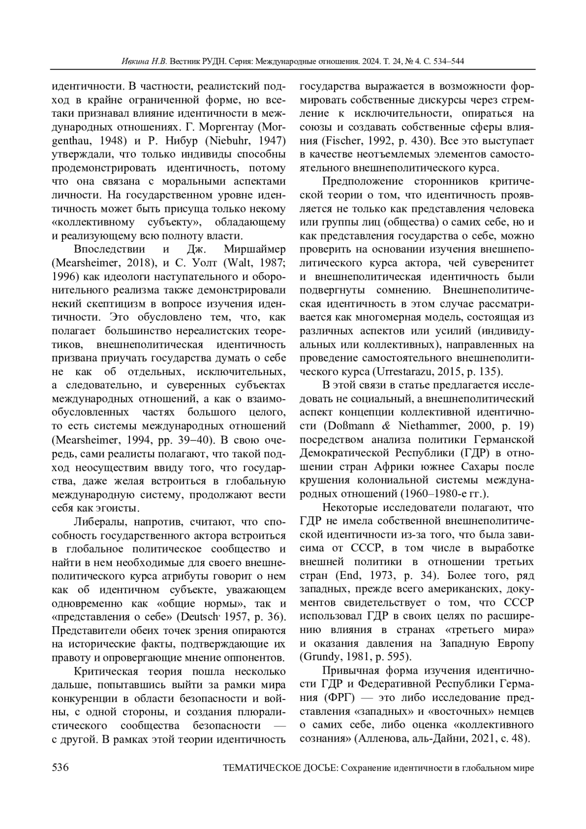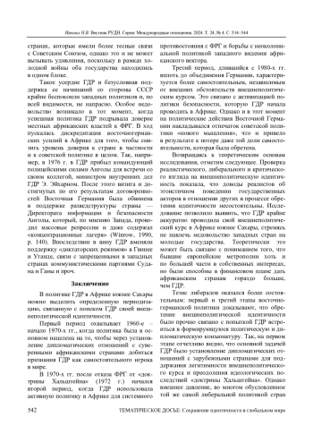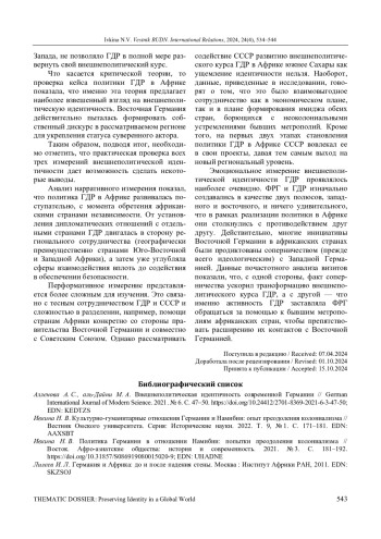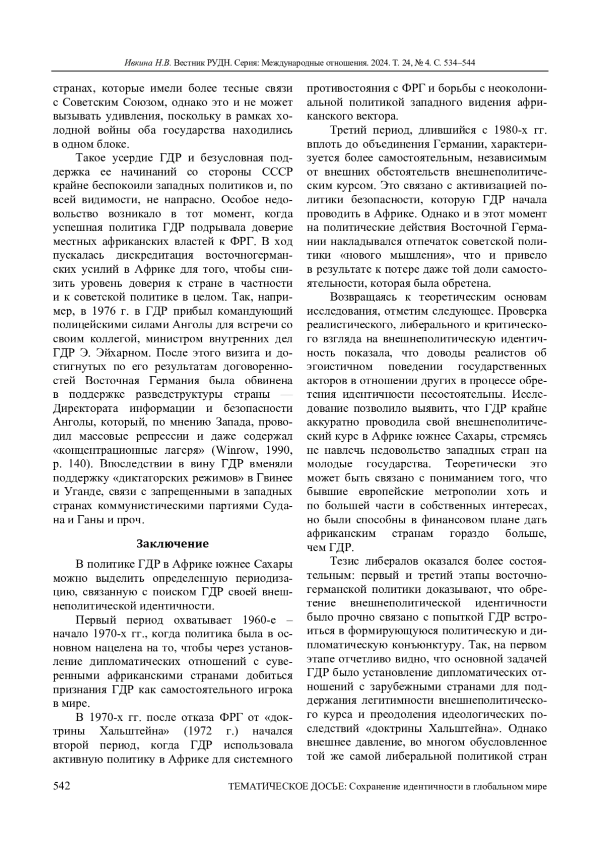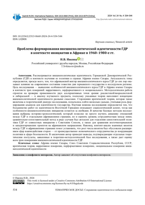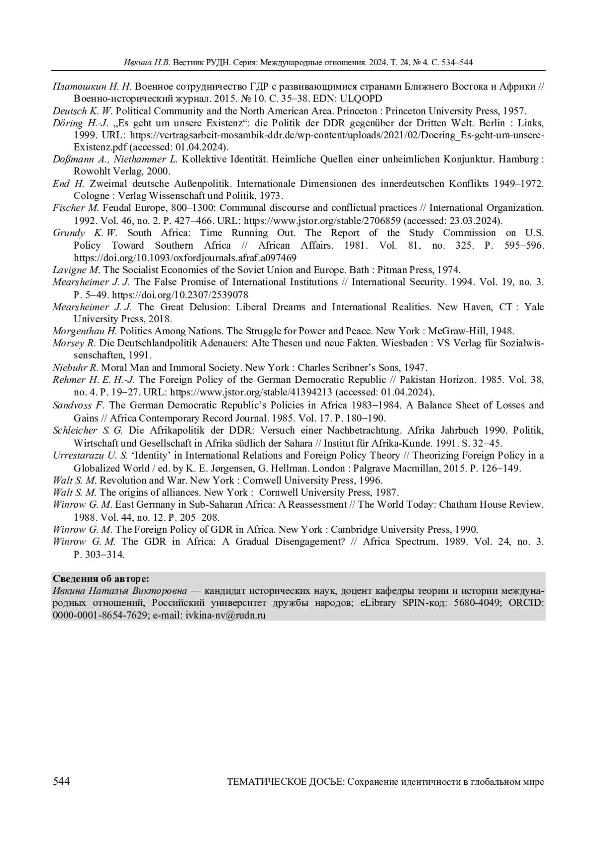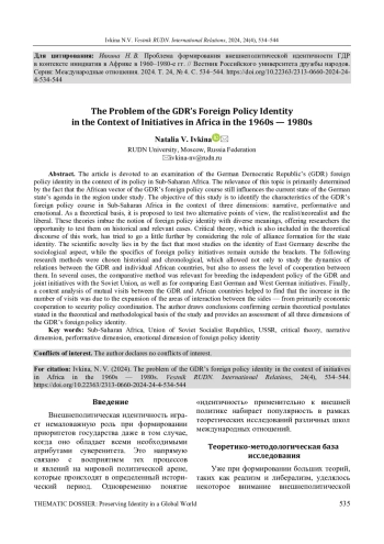 ИВКИНА Н. В. ПРОБЛЕМА ФОРМИРОВАНИЯ ВНЕШНЕПОЛИТИЧЕСКОЙ ИДЕНТИЧНОСТИ ГДР В КОНТЕКСТЕ ИНИЦИАТИВ В АФРИКЕ В 1960-1980-Е ГГ. // ВЕСТНИК РОССИЙСКОГО УНИВЕРСИТЕТА ДРУЖБЫ НАРОДОВ. СЕРИЯ: МЕЖДУНАРОДНЫЕ ОТНОШЕНИЯ. 2024. ТОМ 24 № 4