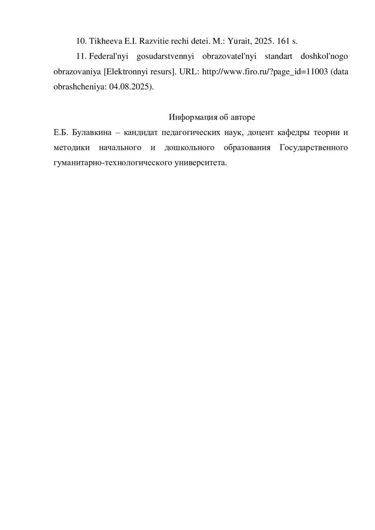 10. Тихеева Е.И. Развитие речи детей. М.: Юрайт, 2025. 161 с.