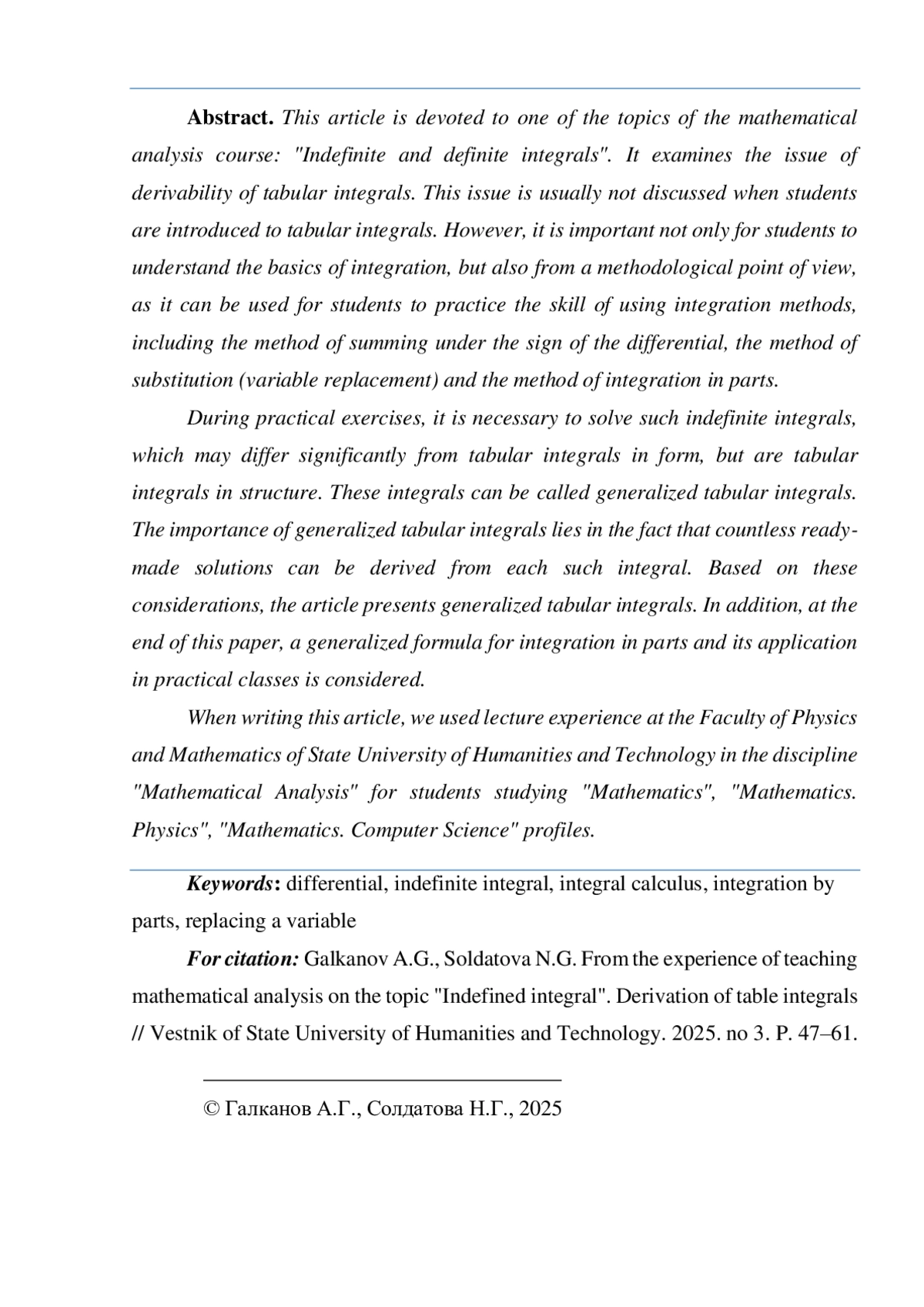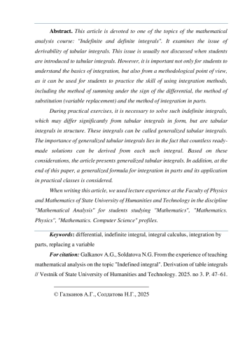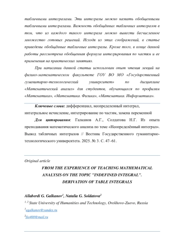 Данная статья посвящена одной из тем курса математического анализа: «Неопределённый и определённый интегралы». В ней рассматривается вопрос выводимости табличных интегралов. Этот вопрос обычно не обсуждается при знакомстве обучающихся с табличными интегралами. Однако он важен не только для понимания студентами основ интегрирования, но и с методической точки зрения, так как может быть применен для отработки студентами навыка применения методов интегрирования, среди которых метод подведения под знак дифференциала, метод подстановки (замены переменной) и метод интегрирования по частям. При проведении практических занятий приходится решать и такие неопределённые интегралы, которые по форме существенно могут отличаться от табличных интегралов, но по структуре являются табличными интегралами. Эти интегралы можно назвать обобщенными табличными интегралами. Важность обобщённых табличных интегралов в том, что из каждого такого интеграла можно вывести бесчисленное множество готовых решений. Исходя из этих соображений, в статье приведены обобщённые табличные интегралы. Кроме того, в конце данной работы рассмотрена обобщенная формула интегрирования по частям и ее применения на практических занятиях. При написании данной статьи использован опыт чтения лекций на физико-математическом факультете ГОУ ВО МО «Государственный гуманитарно-технологический университет» по дисциплине «Математический анализ» для студентов, обучающихся по профилям «Математика», «Математика. Физика», «Математика. Информатика».