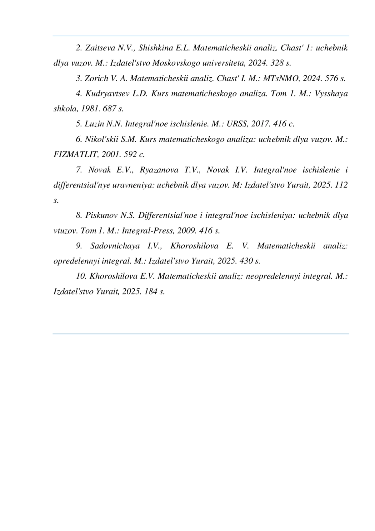 10. Хорошилова Е. В. Математический анализ: неопределенный интеграл. М.: Издательство Юрайт, 2025. 184 с.