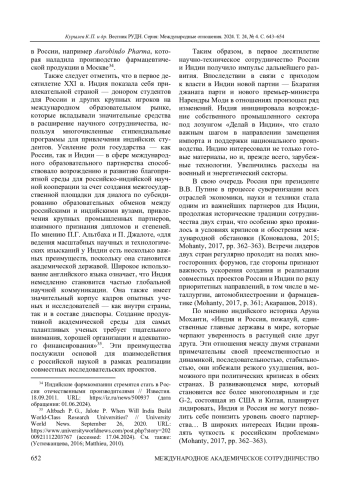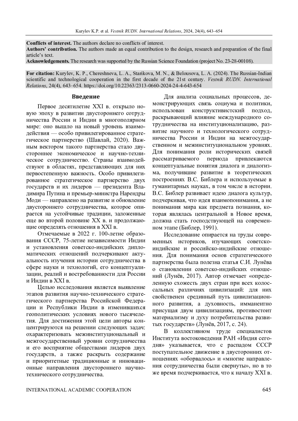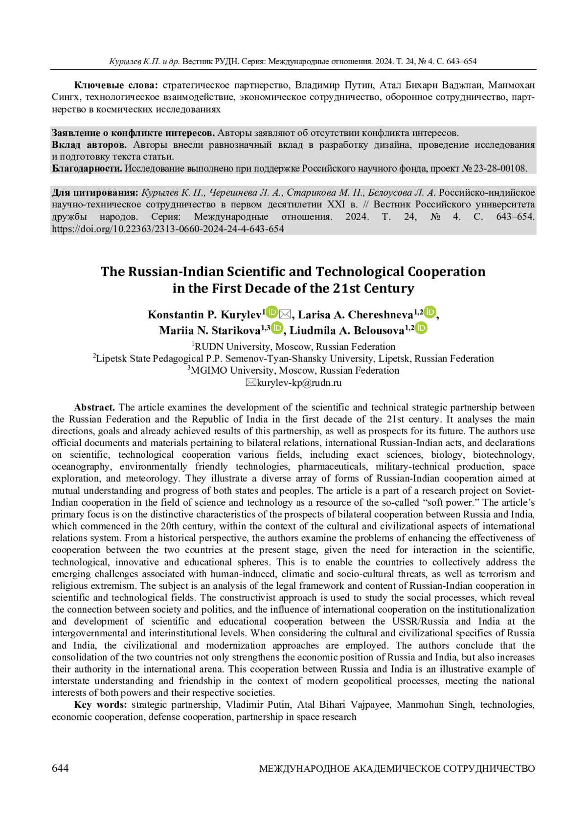 КУРЫЛЕВ К. П., CHERESHNEVA L. A., СТАРИКОВА М. Н., БЕЛОУСОВА Л. А. РОССИЙСКО-ИНДИЙСКОЕ НАУЧНО-ТЕХНИЧЕСКОЕ СОТРУДНИЧЕСТВО В ПЕРВОМ ДЕСЯТИЛЕТИИ XXI В. // ВЕСТНИК РОССИЙСКОГО УНИВЕРСИТЕТА ДРУЖБЫ НАРОДОВ. СЕРИЯ: МЕЖДУНАРОДНЫЕ ОТНОШЕНИЯ. 2024. ТОМ 24 № 4