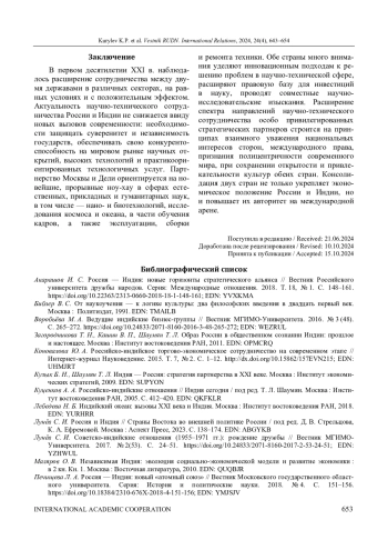 Статья: РОССИЙСКО-ИНДИЙСКОЕ НАУЧНО-ТЕХНИЧЕСКОЕ СОТРУДНИЧЕСТВО В ПЕРВОМ ДЕСЯТИЛЕТИИ XXI В. (2024)
