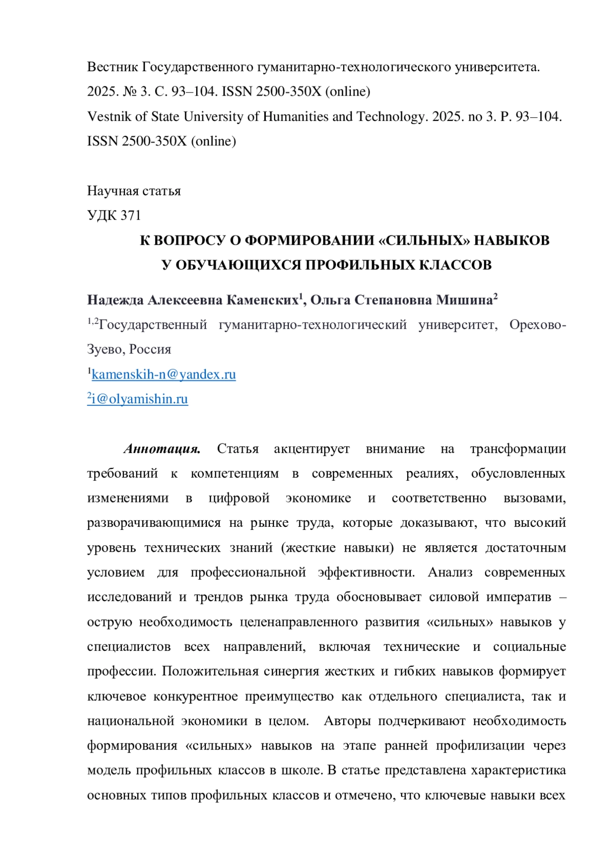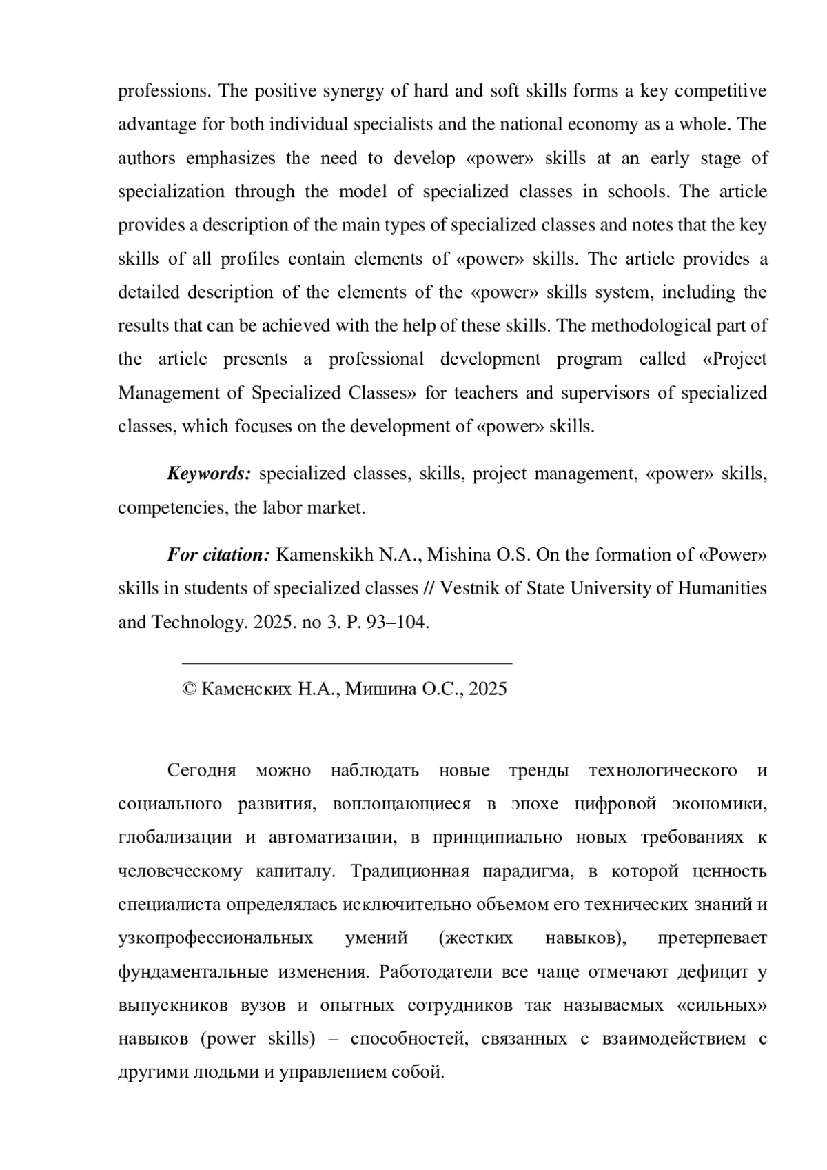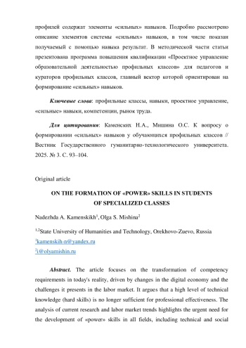 Статья акцентирует внимание на трансформации требований к компетенциям в современных реалиях, обусловленных изменениями в цифровой экономике и соответственно вызовами, разворачивающимися на рынке труда, которые доказывают, что высокий уровень технических знаний (жесткие навыки) не является достаточным условием для профессиональной эффективности. Анализ современных исследований и трендов рынка труда обосновывает силовой императив - острую необходимость целенаправленного развития «сильных» навыков у специалистов всех направлений, включая технические и социальные профессии. Положительная синергия жестких и гибких навыков формирует ключевое конкурентное преимущество как отдельного специалиста, так и национальной экономики в целом. Авторы подчеркивают необходимость формирования «сильных» навыков на этапе ранней профилизации через модель профильных классов в школе. В статье представлена характеристика основных типов профильных классов и отмечено, что ключевые навыки всех профилей содержат элементы «сильных» навыков. Подробно рассмотрено описание элементов системы «сильных» навыков, в том числе показан получаемый с помощью навыка результат. В методической части статьи презентована программа повышения квалификации «Проектное управление образовательной деятельностью профильных классов» для педагогов и кураторов профильных классов, главный вектор которой ориентирован на формирование «сильных» навыков.