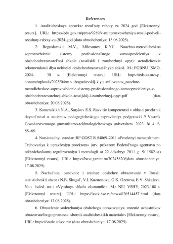 2. Богуславский М.В., Милованов К.Ю. Научно-методическое сопровождение системы профессионального самоопределения в общеобразовательной школе (российский и зарубежный опыт): методические рекомендации для учителей общеобразовательных школ. М.: ФГБНУ ИСМО, 2024. 30 с. [Электронный ресурс]. URL: https://edsoo.ru/wp-content/uploads/2025/04/m.v.-boguslavskij-k.yu.-milovanov_nauchno-metodicheskoe-soprovozhdenie-sistemy-professionalnogo-samoopredeleniya-v-obshheobrazovatelnoj-shkole-rossijskij-i-zarubezhnyj-opyt.pdf (дата обращения: 20.08.2025). EDN: QZSISW