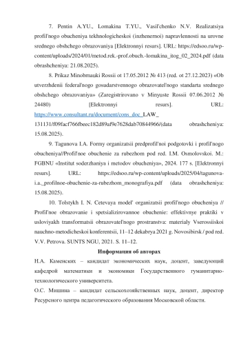 7. Пентин А.Ю., Ломакина Т.Ю., Васильченко Н.В. Реализация профильного обучения технологической (инженерной) направленности на уровне среднего общего образования [Электронный ресурс]. URL: https://edsoo.ru/wp-content/uploads/2024/01/metod.rek.-prof.obuch.-lomakina_itog_02_2024.pdf (дата обращения: 21.08.2025).
