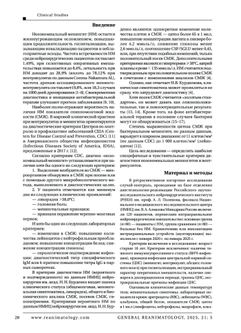 Ключевые фразы: нозокомиальный менингит, инфекция цнс, критерии диагностики нозоко- миального менингита