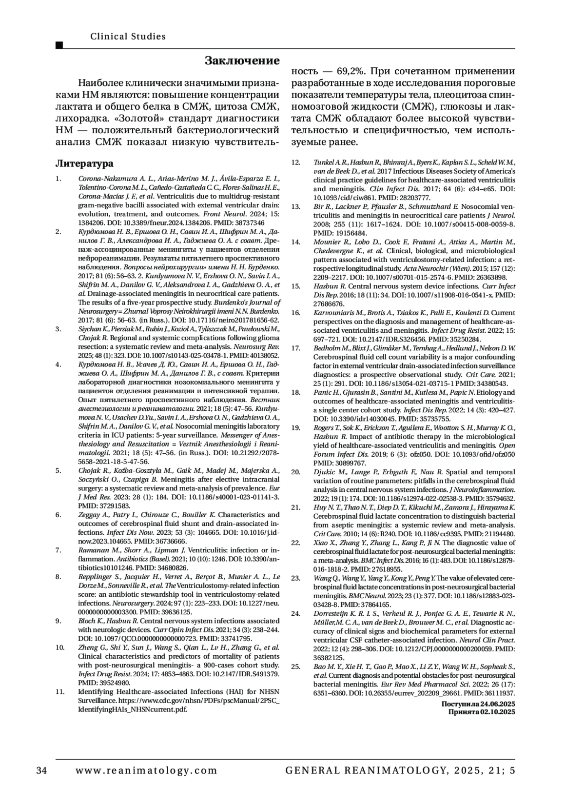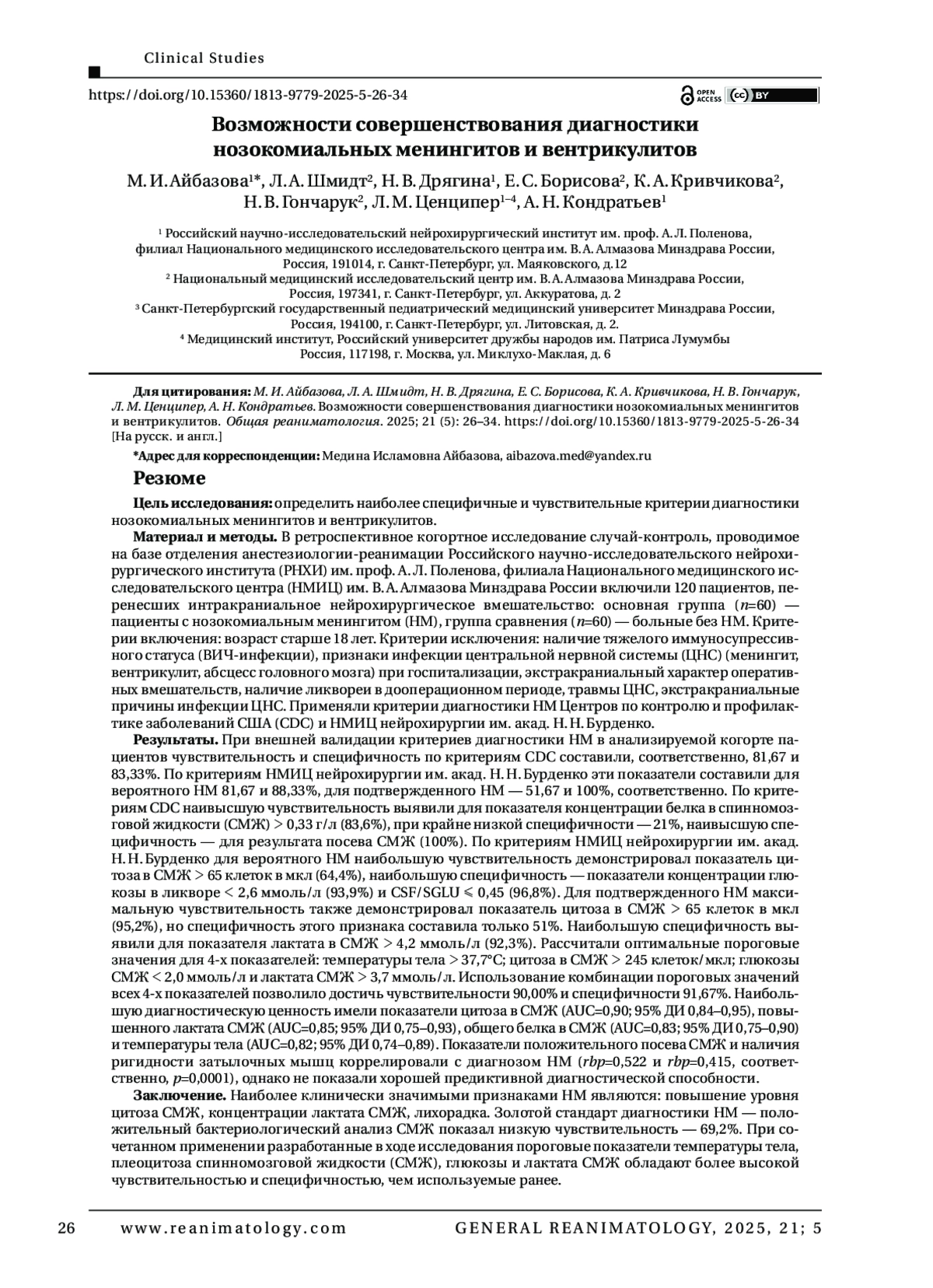 ДРЯГИНА Н. В., АЙБАЗОВА М.И., ШМИДТ Л.А., БОРИСОВА Е.С., КРИВЧИКОВА К.А., ГОНЧАРУК Н.В., ЦЕНЦИПЕР Л. М., КОНДРАТЬЕВ А.Н. ВОЗМОЖНОСТИ СОВЕРШЕНСТВОВАНИЯ ДИАГНОСТИКИ НОЗОКОМИАЛЬНЫХ МЕНИНГИТОВ И ВЕНТРИКУЛИТОВ // ОБЩАЯ РЕАНИМАТОЛОГИЯ. 2025. № 5, ТОМ 21