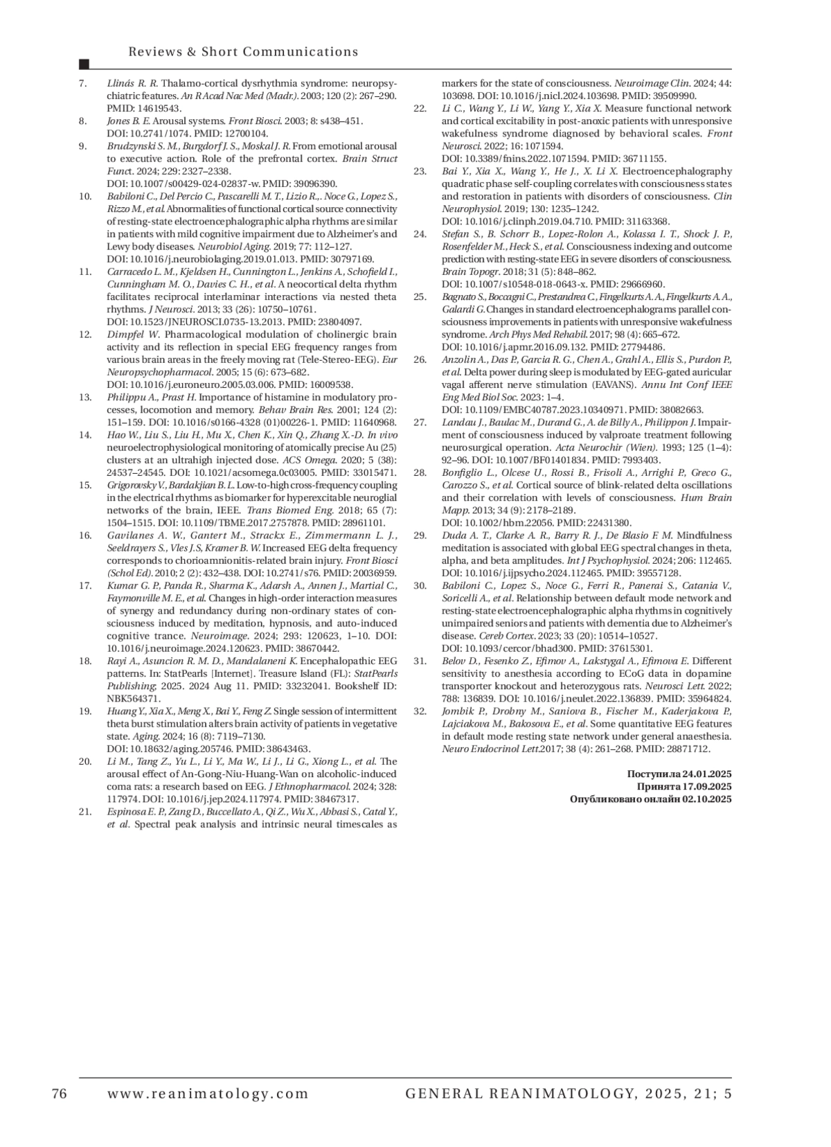 Заключение. Дельта-ритмы служат важнейшими биомаркерами состояний нарушенного сознания и представляют диагностическую, прогностическую и терапевтическую ценность. Мультимодальные подходы, объединяющие ЭЭГ, нейровизуализацию и механистические исследования, необходимы для углубления понимания и улучшения клинических результатов при лечении пациентов в состоянии нарушенного сознания.