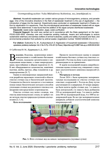 Хозяйственно - бытовые сточные воды могут содержать различные группы микроорганизмов, простейших и яиц паразитов. Одним из инновационных направлений в области очистки сточных вод является применение альголизации - введение в водоём микроводорослей. Были проведены эксперименты по очистке сточных вод очистных сооружений г. Ростов - на - Дону путем альголизации их в аквариумах. Затем были определены микробиологические показатели сточных вод, очищенных с помощью альгологического комплекса водорослей. Установлено, что внесение комплекса микроводорослей очищает и обеззараживает сточные воды.