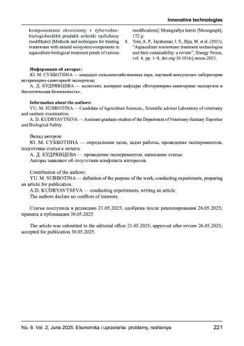 7. Субботина Ю. М. Методы и способы очистки сточных вод естественными компонентами экосистемы в рыбоводно-биологических прудах очистки различной модификации: монография. - 2022. - 172 с.