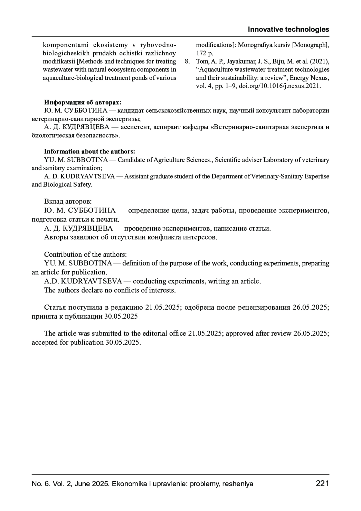 8. Tom A. P., Jayakumar J. S., Biju M. et al. Aquaculture wastewater treatment technologies and their sustainability: a review // Energy Nexus.- 2021. - Vol. 4. - P. 1-9. -. DOI: 10.1016/j.nexus.2021 EDN: GWLLEY