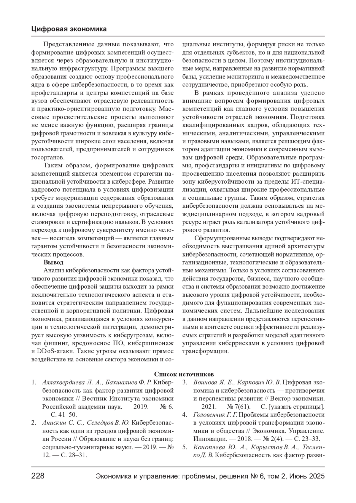 1. Аллахвердиева Л. А., Бахшалиев Ф. Р. Кибербезопасность как фактор развития цифровой экономики // Вестник Института экономики Российской академии наук. - 2019. - № 6.- С. 41-50. EDN: ZSVMQZ