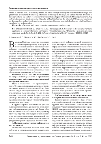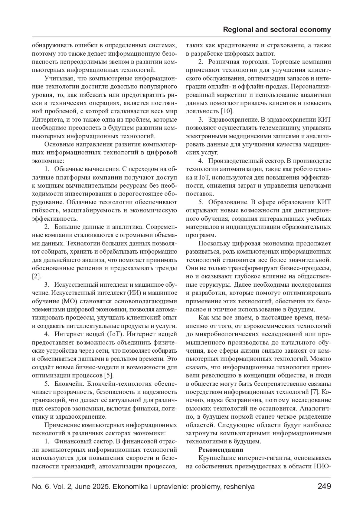 Развитие интернет-технологий вызвало потрясающие изменения в жизни и работе людей и в определенной степени способствовало развитию общества. С постоянным обновлением и прогрессом компьютерных технологий области их применения станут более обширными и тесно связанными с жизнью людей. В статье представлены основные концепции компьютерных информационных технологий, проанализированы типичные области применения вычислительных технологий на данном этапе и направления развития и применения в контексте цифровой экономики. Обсуждаются ключевые технологии, такие как облачные вычисления, большие данные, искусственный интеллект, интернет вещей и блокчейн, а также их влияние на различные секторы экономики, включая финансы, розничную торговлю, здравоохранение, производственный сектор и образование.