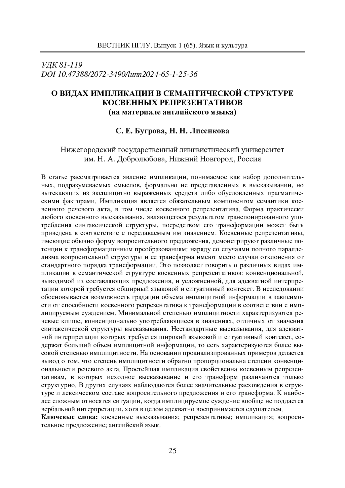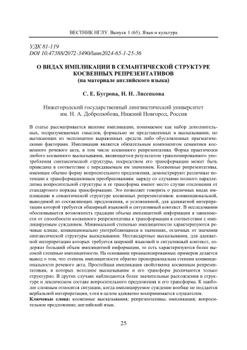 В статье рассматривается явление импликации, понимаемое как набор дополнительных, подразумеваемых смыслов, формально не представленных в высказывании, но вытекающих из эксплицитно выраженных средств либо обусловленных прагматическими факторами. Импликация является обязательным компонентом семантики косвенного речевого акта, в том числе косвенного репрезентатива. Форма практически любого косвенного высказывания, являющегося результатом транспонированного употребления синтаксической структуры, посредством его трансформации может быть приведена в соответствие с передаваемым им значением. Косвенные репрезентативы, имеющие обычно форму вопросительного предложения, демонстрируют различные потенции к трансформационным преобразованиям: наряду со случаями полного параллелизма вопросительной структуры и ее трансформа имеют место случаи отклонения от стандартного порядка трансформации. Это позволяет говорить о различных видах импликации в семантической структуре косвенных репрезентативов: конвенциональной, выводимой из составляющих предложения, и усложненной, для адекватной интерпретации которой требуется обширный языковой и ситуативный контекст. В исследовании обосновывается возможность градации объема имплицитной информации в зависимости от способности косвенного репрезентатива к трансформации в соответствии с имплицируемым суждением. Минимальной степенью имплицитности характеризуются речевые клише, конвенционально употребляющиеся в значениях, отличных от значения синтаксической структуры высказывания. Нестандартные высказывания, для адекватной интерпретации которых требуется широкий языковой и ситуативный контекст, содержат больший объем имплицитной информации, то есть характеризуются более высокой степенью имплицитности. На основании проанализированных примеров делается вывод о том, что степень имплицитности обратно пропорциональна степени конвенциональности речевого акта. Простейшая импликация свойственна косвенным репрезентативам, в которых исходное высказывание и его трансформ различаются только структурно. В других случаях наблюдаются более значительные расхождения в структуре и лексическом составе вопросительного предложения и его трансформа. К наиболее сложным относятся ситуации, когда имплицируемое суждение вообще не поддается вербальной интерпретации, хотя в целом адекватно воспринимается слушателем.