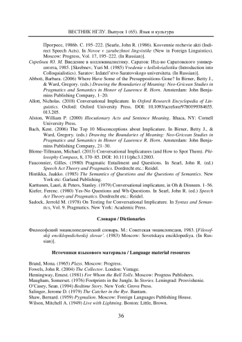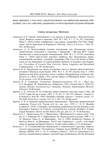 1. Антошина Д. В. Термин “импликация” и его аналоги в прагматике // Филологические науки. Вопросы теории и практики. 2018. № 7 (85). Ч. 1. C. 97-102. EDN: USSFSO