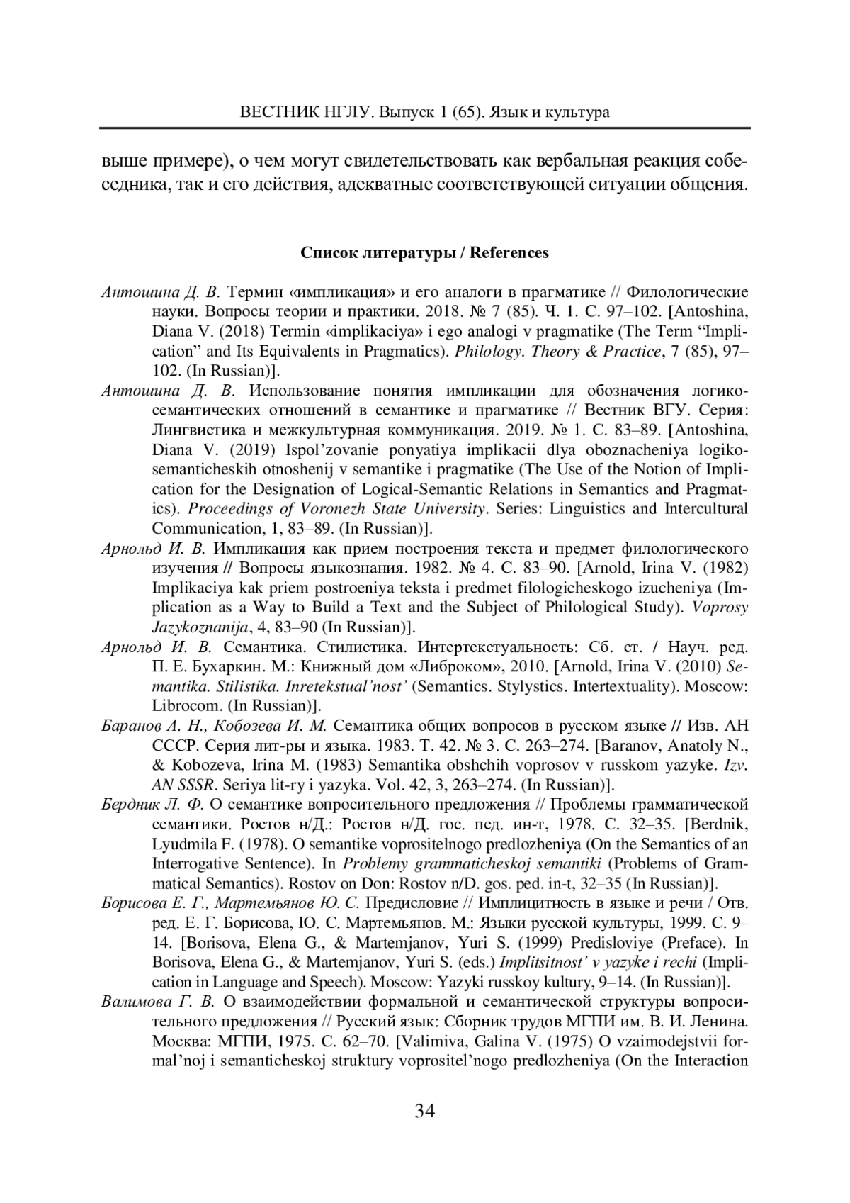 2. Антошина Д. В. Использование понятия импликации для обозначения логико-семантических отношений в семантике и прагматике // Вестник ВГУ. Серия: Лингвистика и межкультурная коммуникация. 2019. № 1. С. 83-89. EDN: UCAEJR