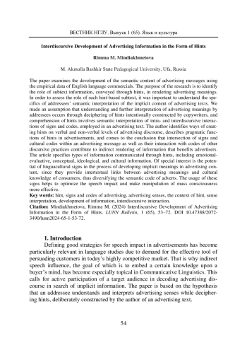 МИНДИАХМЕТОВА Р. М. ИНТЕРДИСКУРСИВНОЕ РАЗВЕРТЫВАНИЕ РЕКЛАМНОЙ ИНФОРМАЦИИ В ФОРМЕ НАМЕКА // ВЕСТНИК НИЖЕГОРОДСКОГО ГОСУДАРСТВЕННОГО ЛИНГВИСТИЧЕСКОГО УНИВЕРСИТЕТА ИМ. Н. А. ДОБРОЛЮБОВА. 2024. № 65