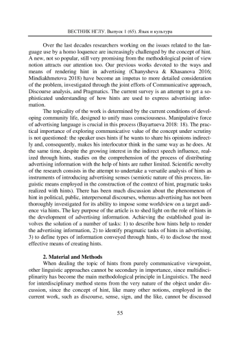 Настоящая работа затрагивает проблематику развертывания смыслового содержания рекламного сообщения. Материалом анализа послужили англоязычные рекламные видеоролики. Цель работы заключается в установлении роли подтекстовой информации, выраженной намеками, в передаче рекламных смыслов. Достижение поставленной цели предполагает выявление специфики смысловой интерпретации адресатом неявно выраженного содержания рекламного текста. В основу исследования положена гипотеза о том, что понимание и толкование рекламных смыслов получателем сообщения происходит путем дешифровки контекстов намекания, преднамеренно сконструированных автором. Прочтение намеков в рекламе представляет собой процедуру смысловой интерпретации внутри- и интердискурсивного взаимодействия знаков и кодов рекламного текста. Выявляются способы создания намеков на вербальном и невербальном уровнях рекламы. Устанавливаются прагматические задачи, решаемые посредством намеков в коммерческой рекламе. Автор приходит к выводу о том, что наложение знаков и кодов культуры в рекламном сообщении, а также их взаимодействие с кодами иных дискурсивных практик способствует косвенной передаче информации, нужной для заказчика рекламы. Определяются следующие виды информации, транслируемые посредством намеков: эмоционально-оценочная, концептуальная, идеологическая и культурная. Особое значение в смысловом развертывании рекламного содержания приобретают знаки лингвокультуры, обеспечивающие интертекстуальные связи между рекламными смыслами и культурным опытом индивида, что, в свою очередь, обогащает смысловой код рекламы. Подключение данных знаков в рекламный контент оптимизирует речевое воздействие и манипуляцию массовым сознанием.