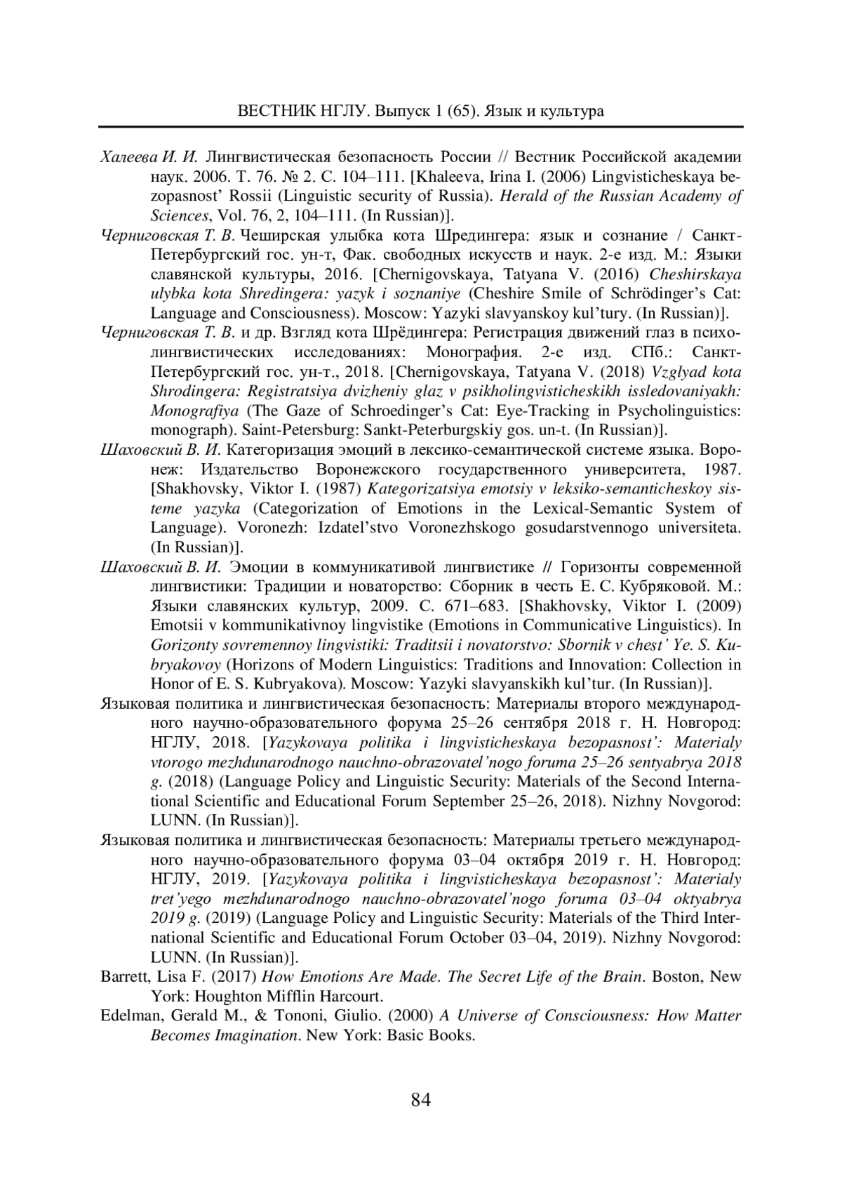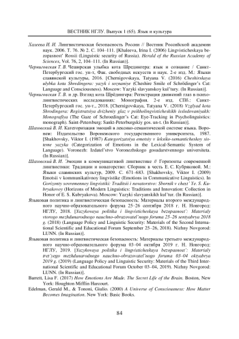 19. Шаховский В. И. Эмоции в коммуникативой лингвистике // Горизонты современной лингвистики: Традиции и новаторство: Сборник в честь Е. С. Кубряковой. М.: Языки славянских культур, 2009. С. 671-683. EDN: TSYORR