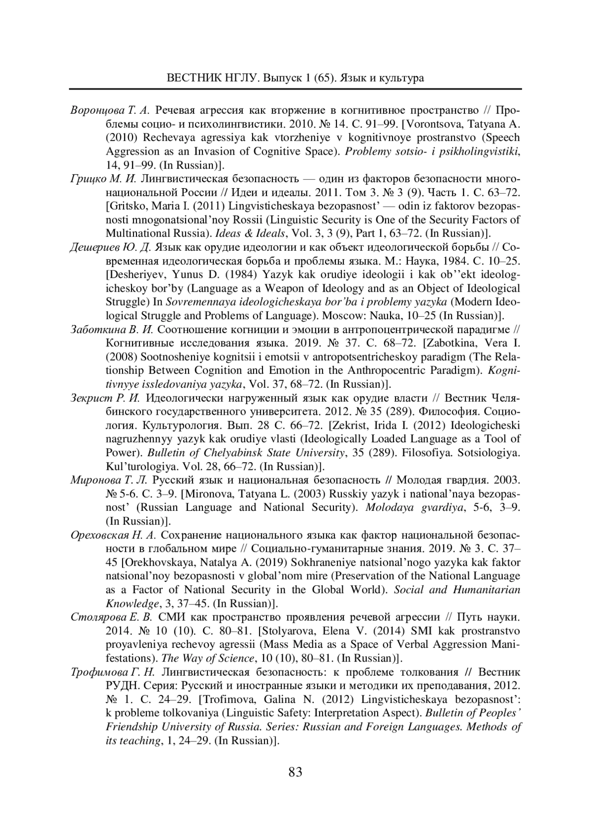 15. Халеева И. И. Лингвистическая безопасность России // Вестник Российской академии наук. 2006. Т. 76. № 2. С. 104-111. EDN: HSYMPD