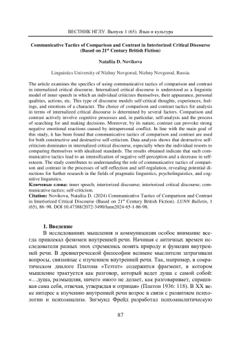В статье представлены результаты исследования, посвященного анализу специфики использования коммуникативных тактик сравнения и противопоставления в интериоризованном критическом дискурсе. Интериоризованный критический дискурс рассматривается как лингвистическая модель внутренней речи, в которой индивид критикует себя, свою внешность, личные качества, поступки и т. д. В таком типе дискурса моделируются самокритические мысли персонажа, его переживания, чувства и эмоции. Выбор тактик сравнения и противопоставления для анализа в интериоризованном критическом дискурсе обусловлен несколькими факторами. Сравнение и противопоставление активно задействуют когнитивные процессы, в частности самоанализ, процесс поиска и принятия решения. Кроме того, противопоставление по своей природе может вызывать сильные негативные эмоциональные реакции, обусловленные внутриличностным конфликтом. В соответствии с главной целью настоящего исследования было выявлено, что коммуникативные тактики сравнения и противопоставления применяются для реализации как конструктивной, так и деструктивной самокритики. Анализ данных показывает, что деструктивная самокритика доминирует в интериоризованном критическом дискурсе, особенно когда личность прибегает к сравнению себя с идеализированными стандартами. Полученный результат указывает на то, что такие коммуникативные тактики приводят к усилению негативного самовосприятия и снижению самооценки. Исследование вносит вклад в понимание роли коммуникативных тактик сравнения и противопоставления в процессах саморефлексии и саморегуляции, раскрывая потенциальные направления для дальнейших исследований в области прагматической лингвистики, психолингвистики и когнитивной лингвистики.