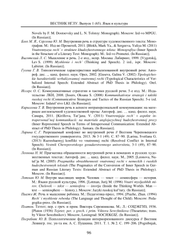 8. Леонова Н. М. Прагматика обращенности внутренней речи в немецких и русских художественных текстах: Автореф. дис.... канд. филол. наук. М., 2005. EDN: NNEDJR