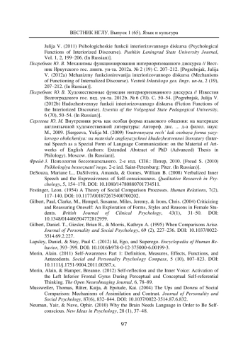 12. Погребняк Ю. В. Психологические функции интериоризованного дискурса // Вестник Ленингр. гос. ун-та им. А. С. Пушкина. 2011. Т. 1. № 2. С. 199-206. EDN: PAPIXN