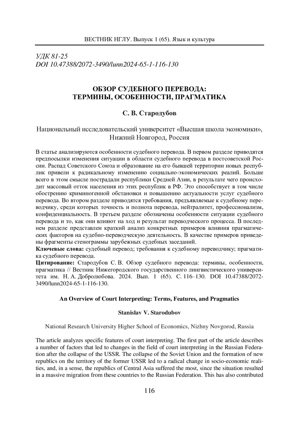 В статье анализируются особенности судебного перевода. В первом разделе приводятся предпосылки изменения ситуации в области судебного перевода в постсоветской России. Распад Советского Союза и образование на его бывшей территории новых республик привели к радикальному изменению социально-экономических реалий. Больше всего в этом смысле пострадали республики Средней Азии, в результате чего происходит массовый отток населения из этих республик в РФ. Это способствует в том числе обострению криминогенной обстановки и повышению актуальности услуг судебного перевода. Во втором разделе приводятся требования, предъявляемые к судебному переводчику, среди которых точность и полнота перевода, нейтралитет, профессионализм, конфиденциальность. В третьем разделе обозначены особенности ситуации судебного перевода и то, как они влияют на ход и результат переводческого процесса. В последнем разделе представлен краткий анализ конкретных примеров влияния прагматических факторов на судебно-переводческую деятельность. В качестве примеров приведены фрагменты стенограммы зарубежных судебных заседаний.