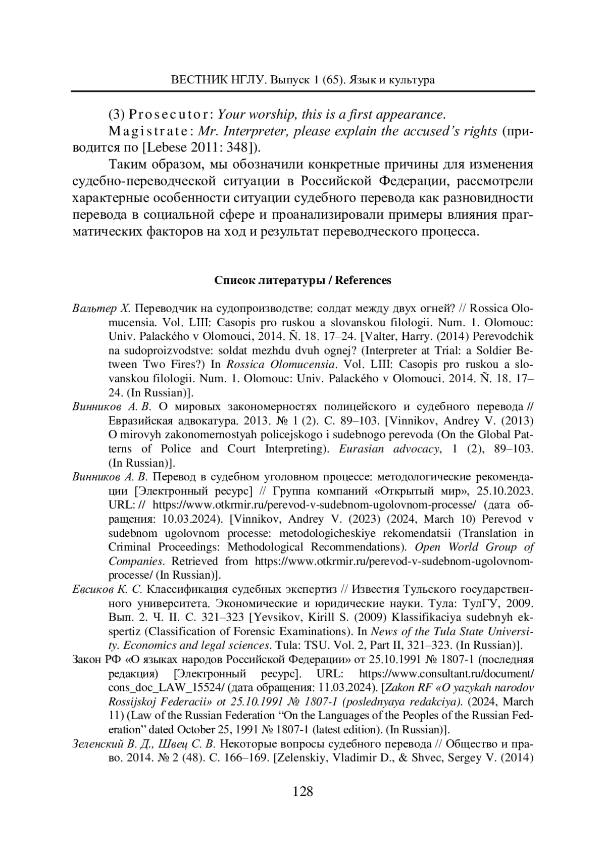 2. Винников А. В. О мировых закономерностях полицейского и судебного перевода // Евразийская адвокатура. 2013. № 1 (2). С. 89-103. EDN: PVRJRF